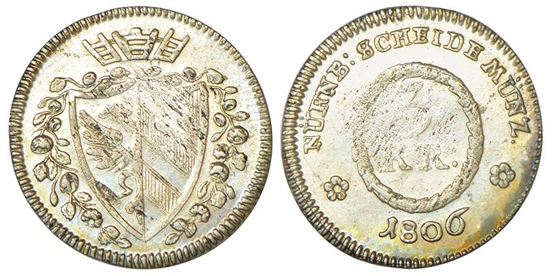 German State-Nurnberg, billion 3 kreuzer, 1806, KM 414, 1.19g. Obv: Crowned shield with garland. Rev: Denomination within beaded circle, date below.