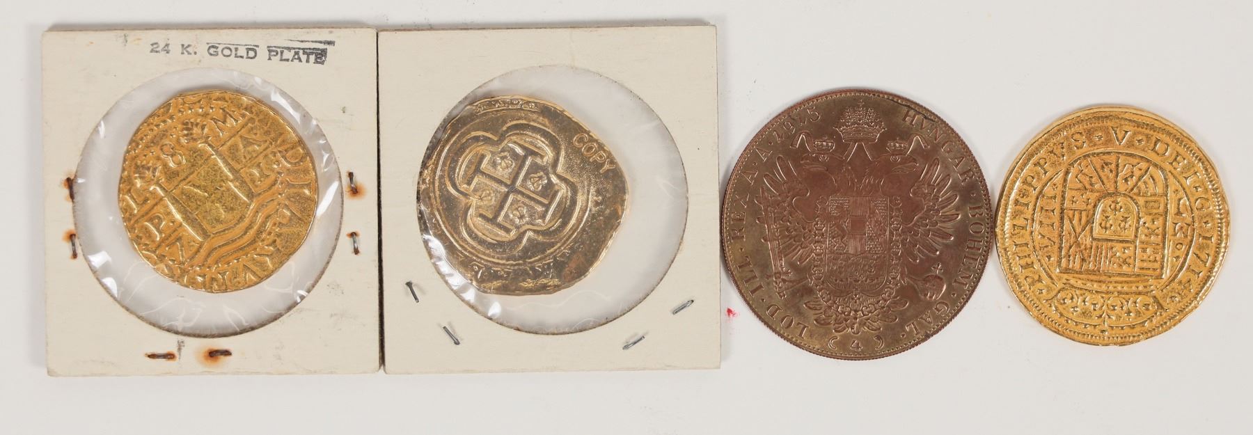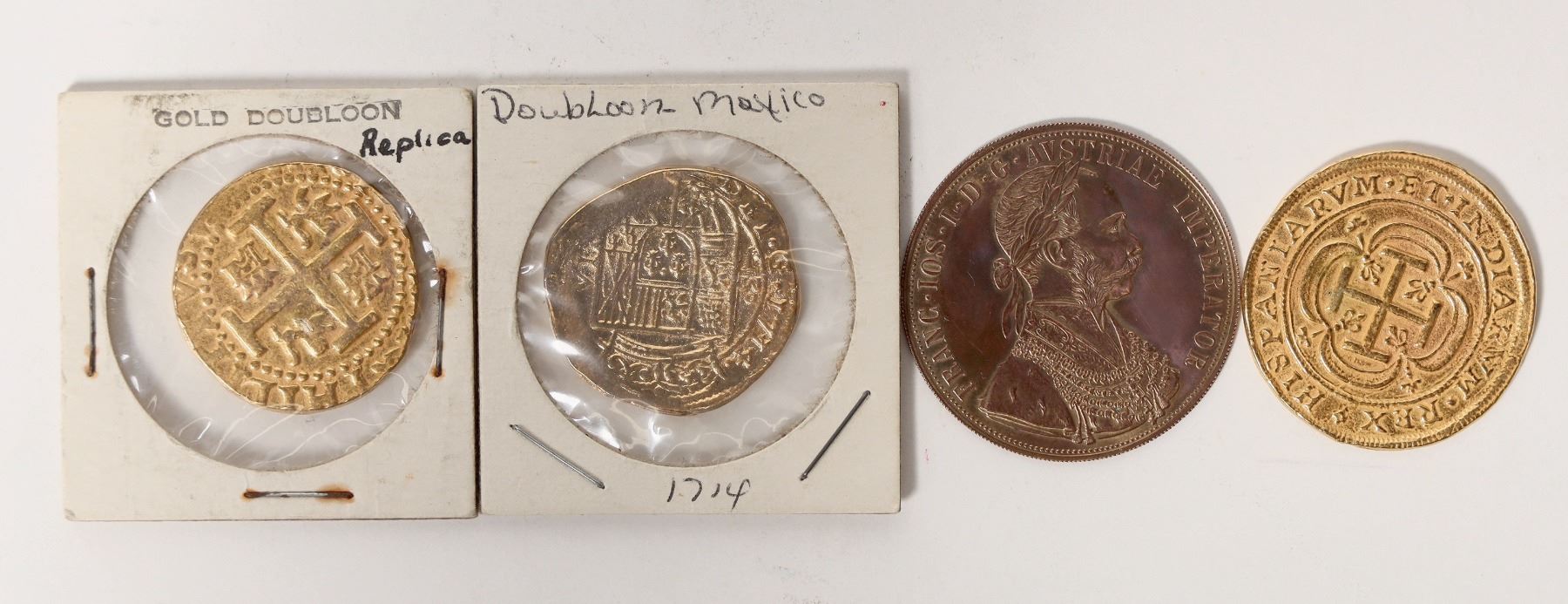 Three replicas of gold doubloons, and an Austrian coin.