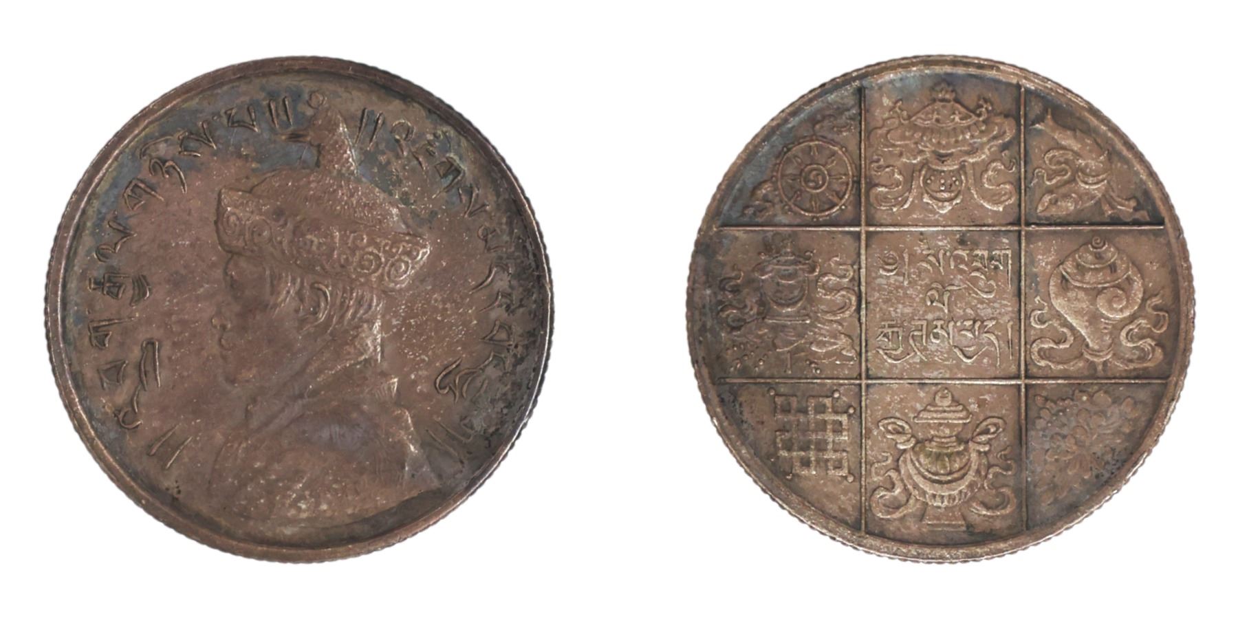 Bhutan, Jigme Wangchuck (1926-1952), Silver ½ Rupee,1928, 5.80g, 24.39mm, Obverse: Crowned bust, left, first legend, Reverse: Nine sections: Eight buddha, symbols, central square: EARTH-DRAGON-YEAR (1928), Toned Very fine, Scarce
