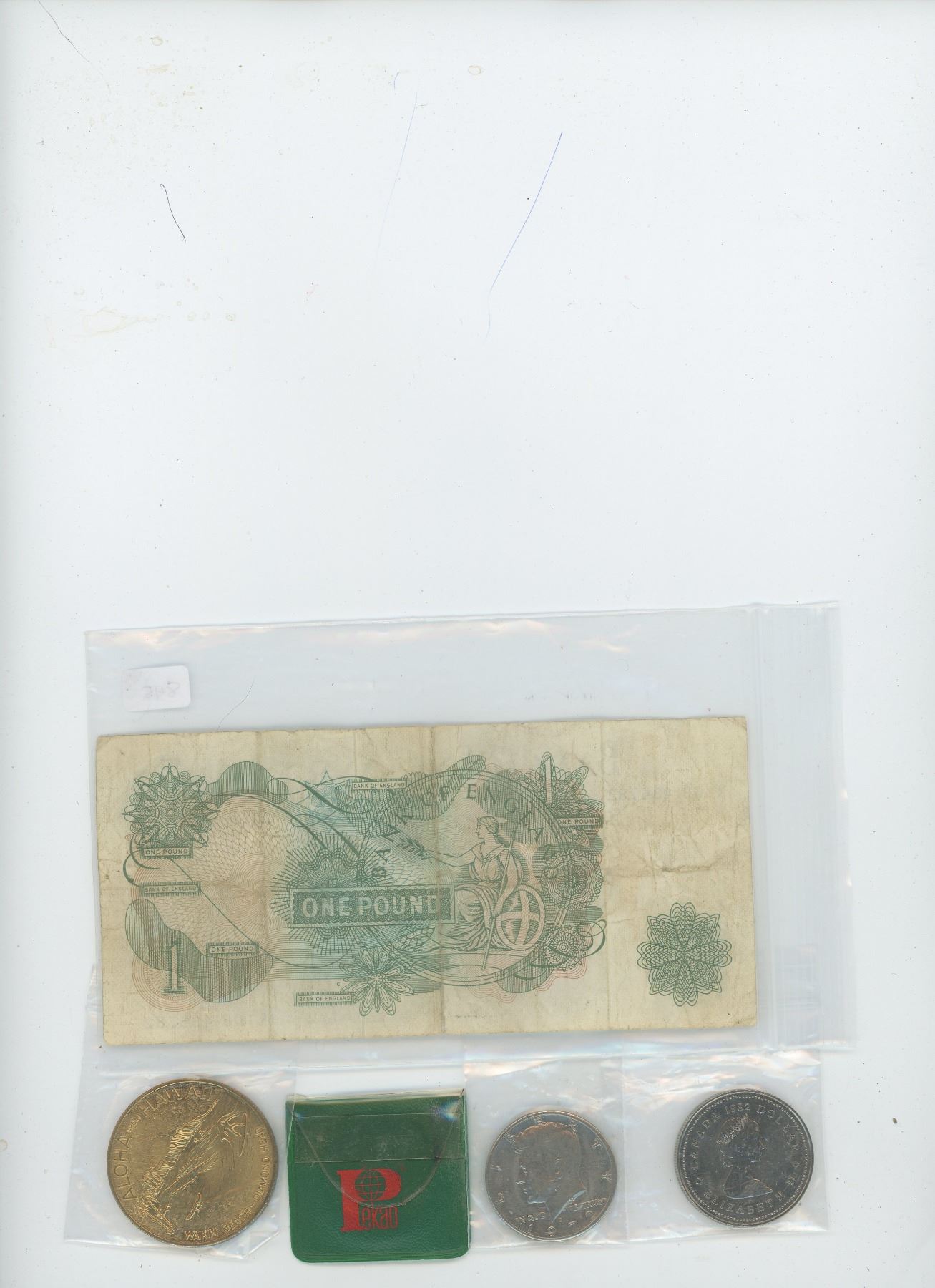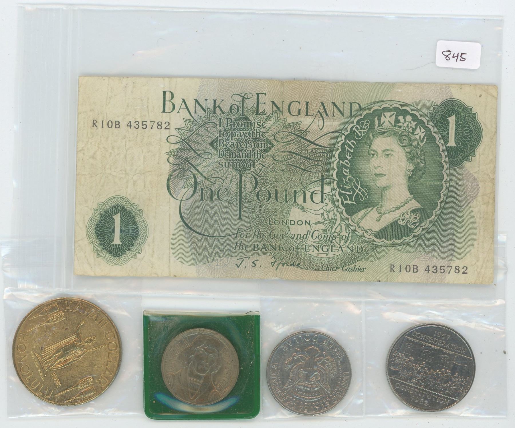 1 Bank of England Note; 1-Hawaiian $1 Coin; 1-US Half Dollar Coin; 1-Canadian Dollar Coin; 1-Polish Coin