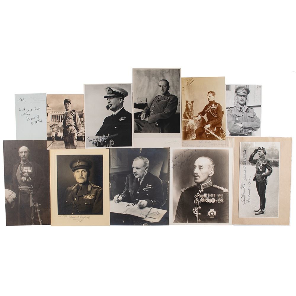 Lot of 11 items individually signed by a foreign military leader, consisting almost entirely of vintage photographs ranging in size from 4.75 x 6.5 to 5.75 x 11, with some inscribed. Subjects include: Harold Alexander, Alan Brooke, Bruce Fraser (2: SP and signature), Bernard Freyberg, Ian Hamilton, Arthur Harris, Alphonse Juin, Sydney Turing Barlow Lawford, Frederick Hugh Sherston Roberts, and George White. In overall fine condition, with light wear or creases.