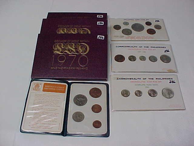 Foreign Mix: 3-1970 Great Britain/North Ireland PF Sets (last set prior to decimal coinage), 5 pc 1971 Decimal Coin Set in folder; 3 Philippine Coin Sets (1945 Unc Coin Type Set, 1937-45 Unc Coin Type Set, 1903-1945 Coin Type Set 7 piece)