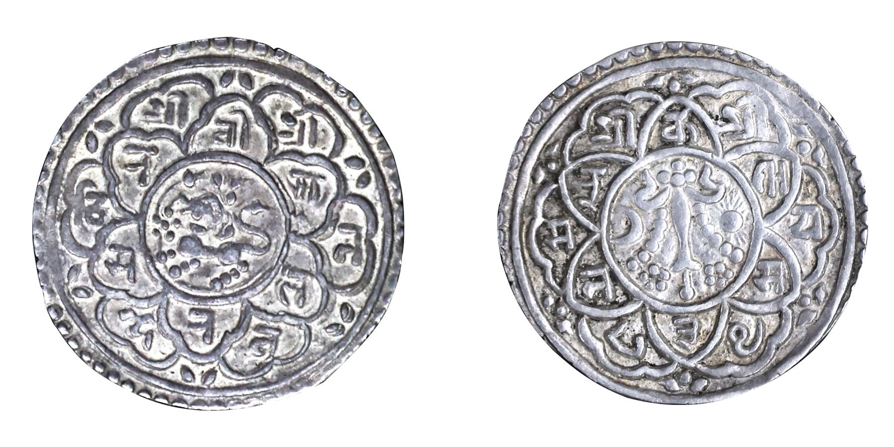 Foreign Coins, Nepal, Kingdom of Patan, Riddhi Narasimha (NS 835-837 / 1715-1717 AD). Silver Mohar, NS 835, 5.34g, 26.13mm, Obv. : Central circle surrounded by six trefoil petals and six further petals in angles, Legend “Sri Sri Vira Hrdhi Naraâ€, Large lion at center, “Mala Devaâ€, two leaves in outer angles., Rev. : sword with sun and moon in central circle, legend in outer triangles and outer angles “Sri Sri Karunamaya 835â€, (RGV# 447, KM# 375). About EF, Scarce