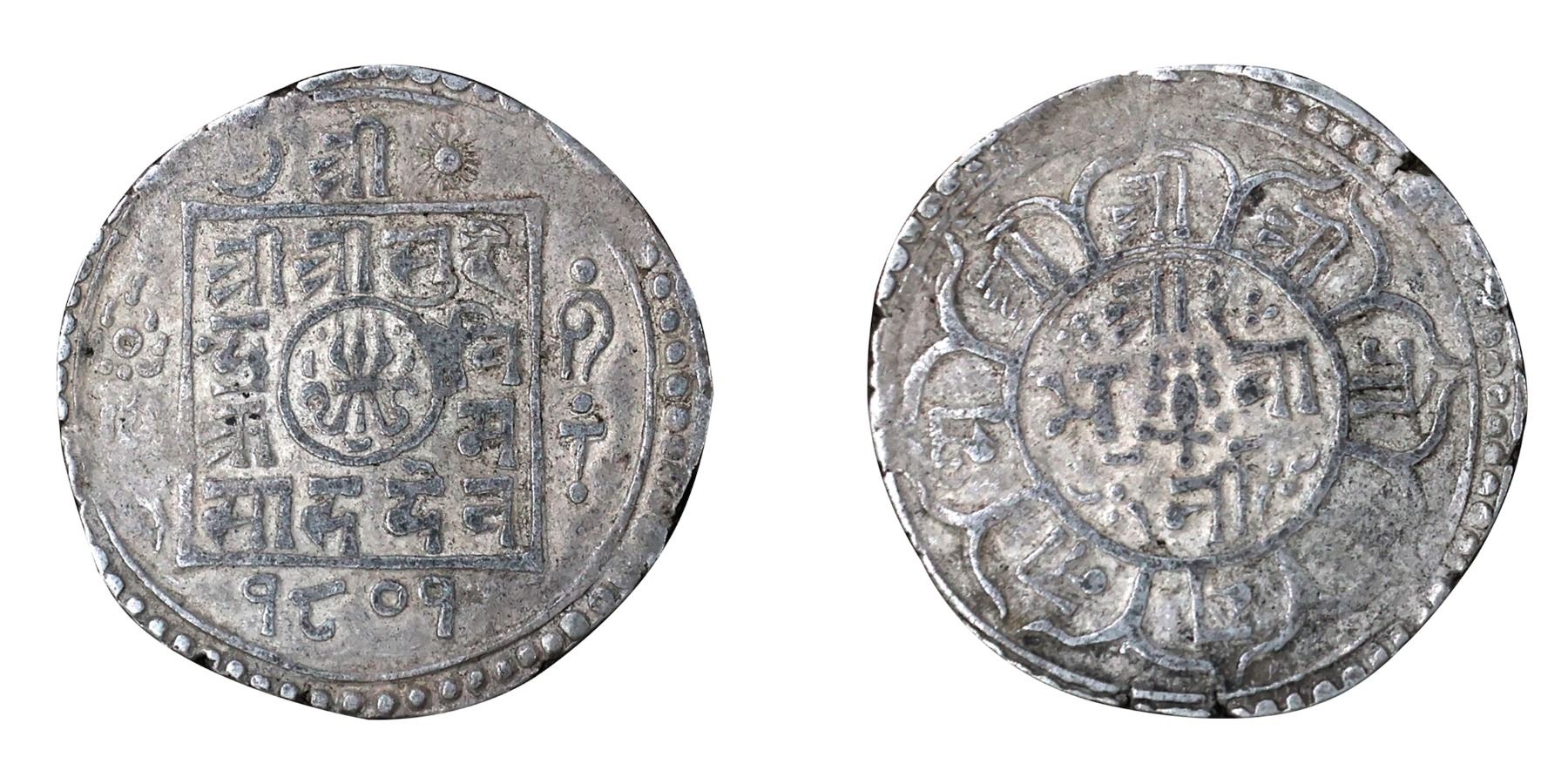 Foreign Coins, Nepal, Shah coins for the Kathmandu Vally, Surendra Vikram Shah (SE 1769-1803 / 1847-1881 AD), Silver Double-Mohar, SE 1801, 10.79g,27.45mm, Obv. small central square with trident, surrounded by legend, all this within square which has openings on three sides and two double arches attached to three sides, but only a single arch attached to the upper side of the square, legend “Sri Sri Sri Sure/ndra Vi/krama/ Saha Deva†and date below, within two double arches, moon to left and sun to right of Sri in upper arch, cakra (discus) and lotus flower within double arches on left side, and conch and mace within double arches on right side, Rev. central circle with eight petals attached to it, sword with garland between two horizontal lines in centre of circle, and legend “Sri 3/Bhava/niâ€, legend in petals, “Sri Sri Sri Gorakhanathaâ€, (RGV# 988,KM# 603.3), Fine+, Scarce