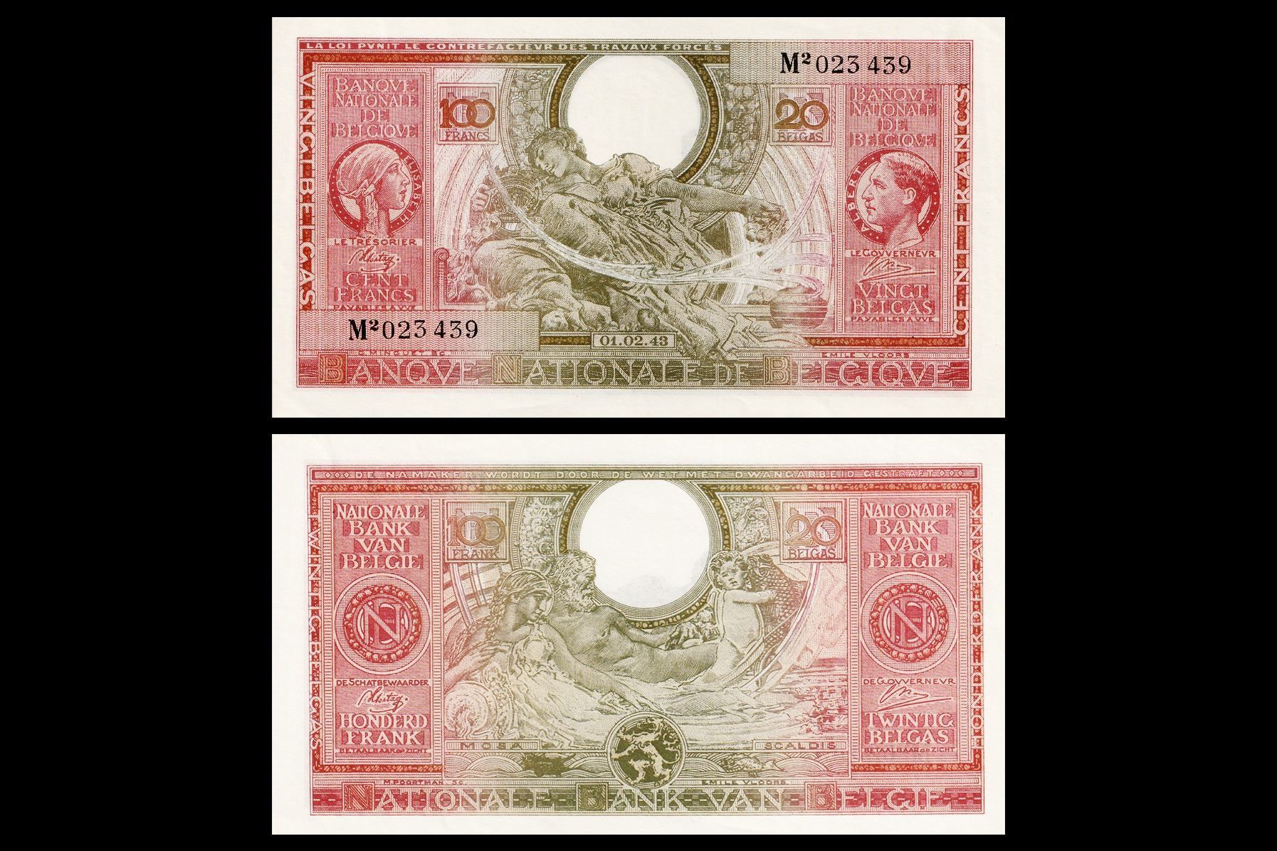Belgium, 100 Francs = 20 Belgas, 1943. Obv- Portrait of Queen Elisabeth at left; reclining woman with crown and fruit at center (allegory of agriculture), King Albert at right. Rev- Allegorical figures at center; coat of arms at left and right. UNC, Scarce. NR-54.