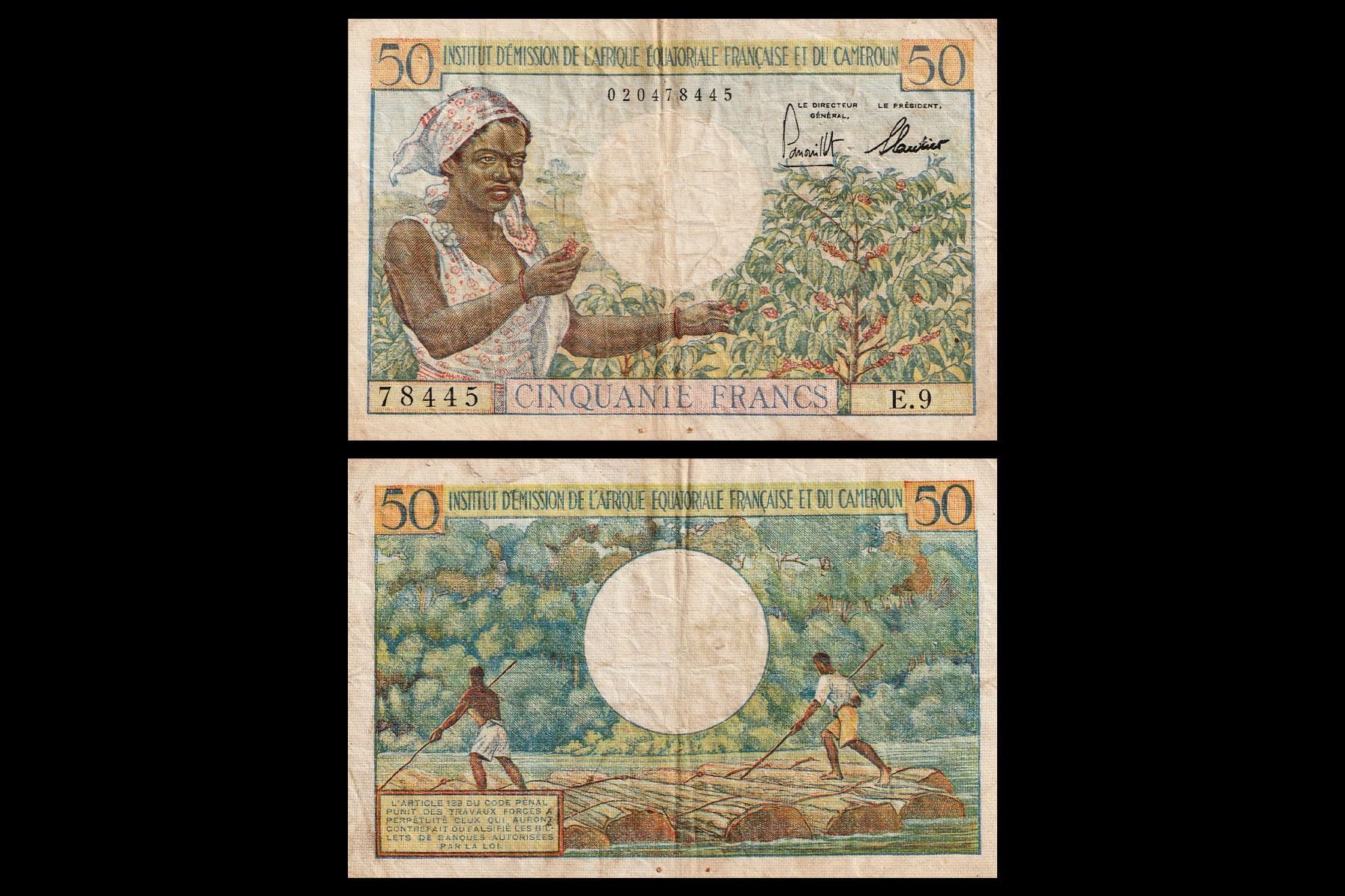 French Equatorial Africa (Central African States, 50 Francs, 1957. Obv- Woman picking coffee beans at left. Rev- Men logging in river at center. VF+, Scarce. NR-77.