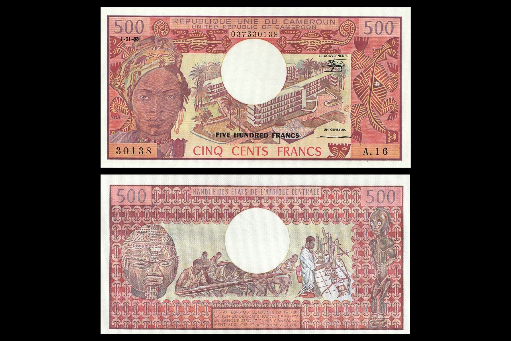 Cameroon, 500 Francs CFA, 1978-1983. Obv- Face of a Cameroonian Fulani woman, University of Yaoundé campus, and Stylised reptiles. Rev- Carved mask and statue, and Students in chemical lab. UNC, Scarce. NR-40.