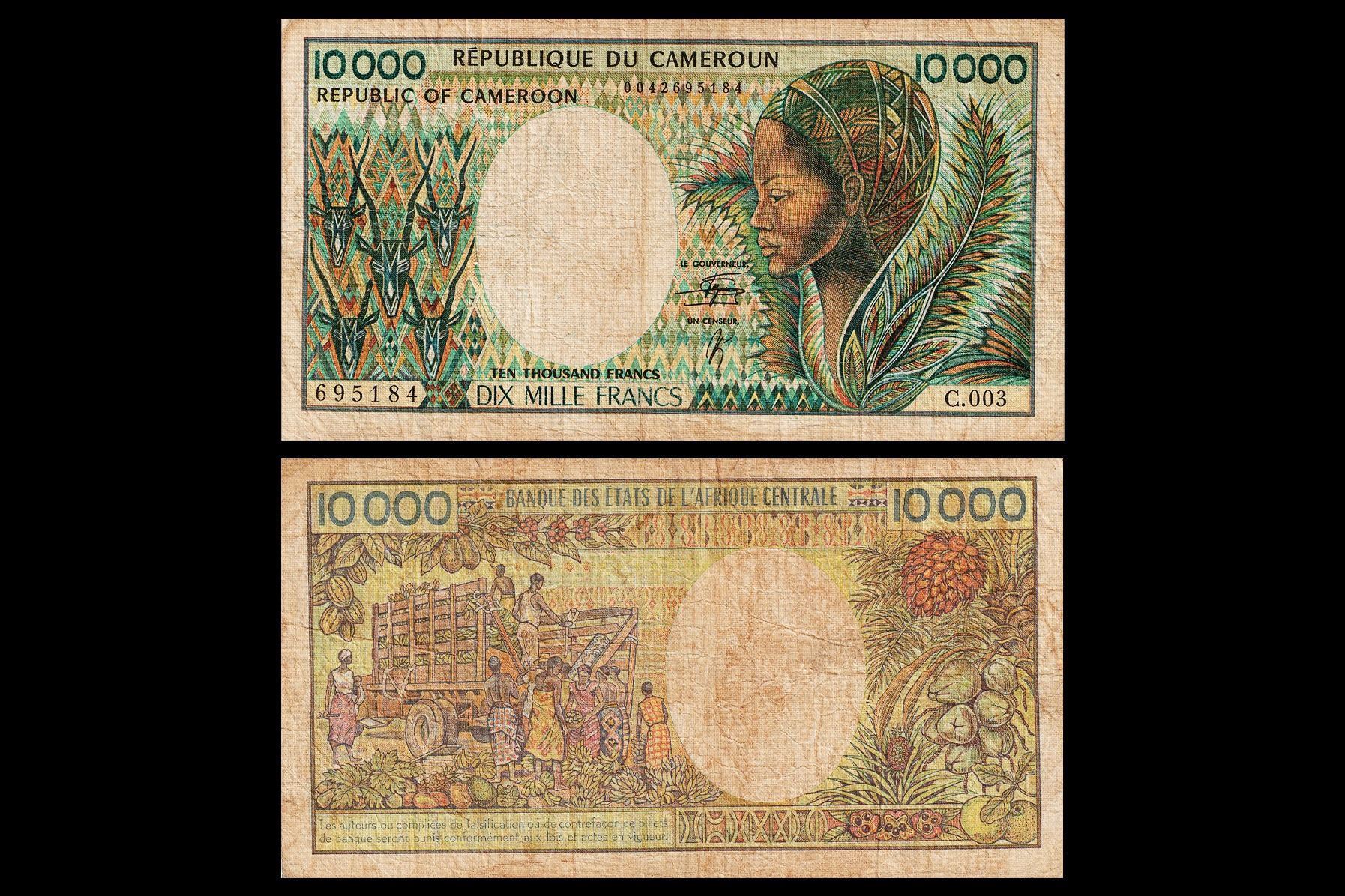 Cameroon, 10,000 Francs CFA, 1983-1990, Obv- Antelope heads at left, woman at right. Rev- People loading bananas onto a truck on the left, and fruits on the right. VF+, Scarce. NR-78.