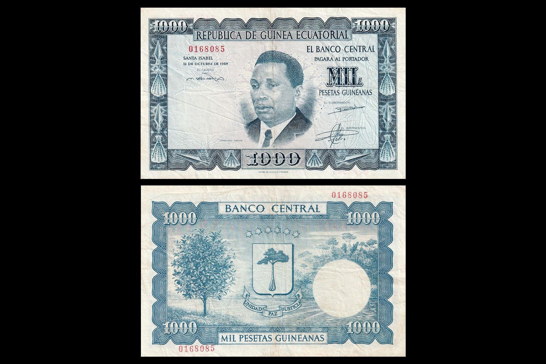 Equatorial Guinea, 1000 Pesetas, 1969, Obv- Bust of president Francisco Macías Nguema Biyogo; coffee berries, cocoa pods, spear heads; geometric designs. Rev- Coffee tree at left; coat of arms of Equatorial Guinea at center; geometric designs. UNC, Scarce. NR-80.