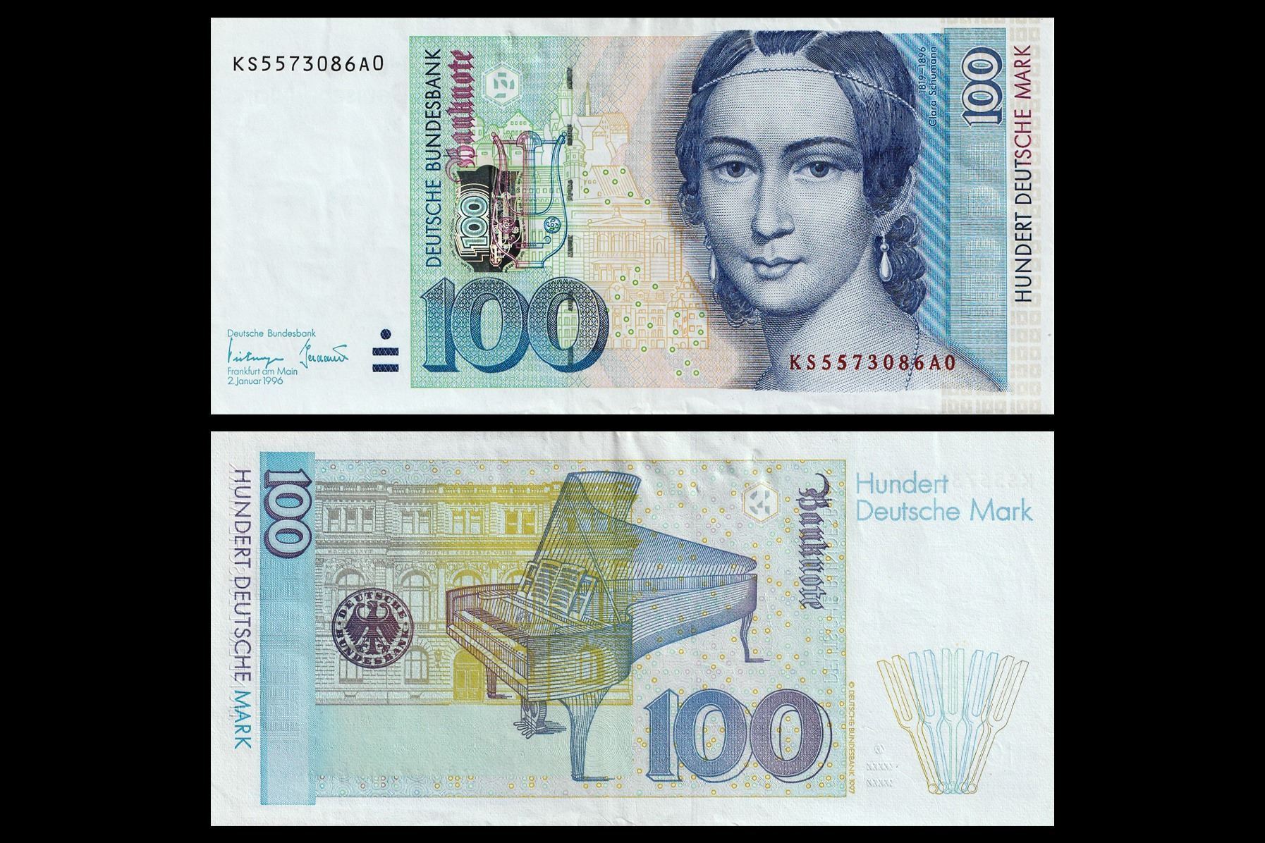 Federal Republic of Germany, 100 Deutsche Mark with holographic device, 1996. Obv- Portrait of Clara Schumann, stylized lyre and historical buildings of Leipzig. Rev- Grand piano in center over Hoch'sche Conservatory in Frankfurt, vibrating tuning fork on the lower right. UNC, Scarce. NR-47.