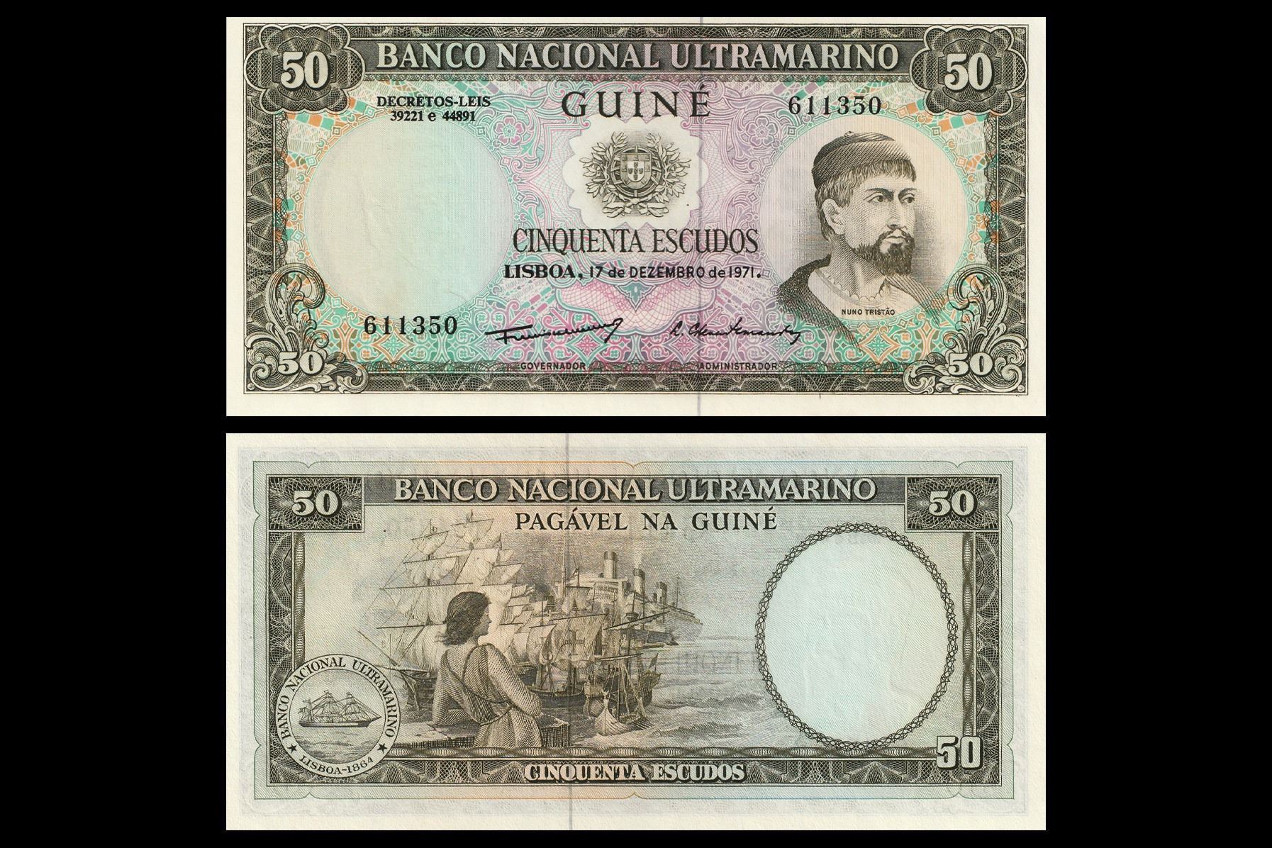 Portuguese Guinea (1910-1975), 50 Escudos, 1971. Obv- Portuguese arms at upper center; portrait of Nuno Tristão at right. Rev- Woman standing; ships through the ages in background at left center, bank ship seal at lower left. UNC, Scarce. NR-32.