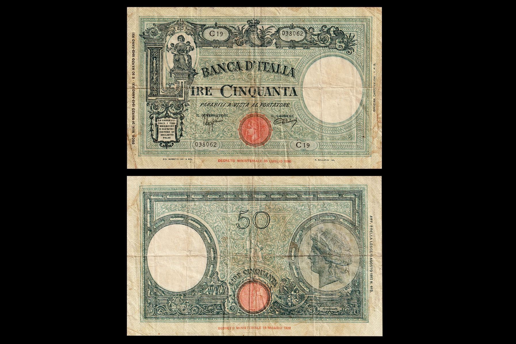 Italy, 50 Lire, 1943, Obv- Banca D'Italia, Lire Cinquanta, Pagabili a vista al portatore. Rev- Fasces seal. VF+, Scarce. NR-62.