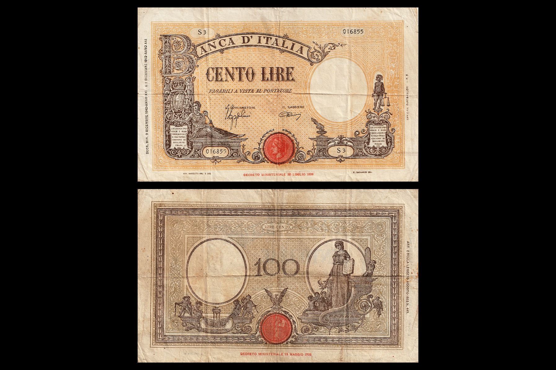 Italy, 100 Lire, 1942-1943, Obv- Seated female figure, representing Knowledge; in the right allegorical genius of Justice with scales and sword. Rev- On the right, a female figure personifying Science, with a torch and a book of human knowledge. XF+, Scarce. NR-66.