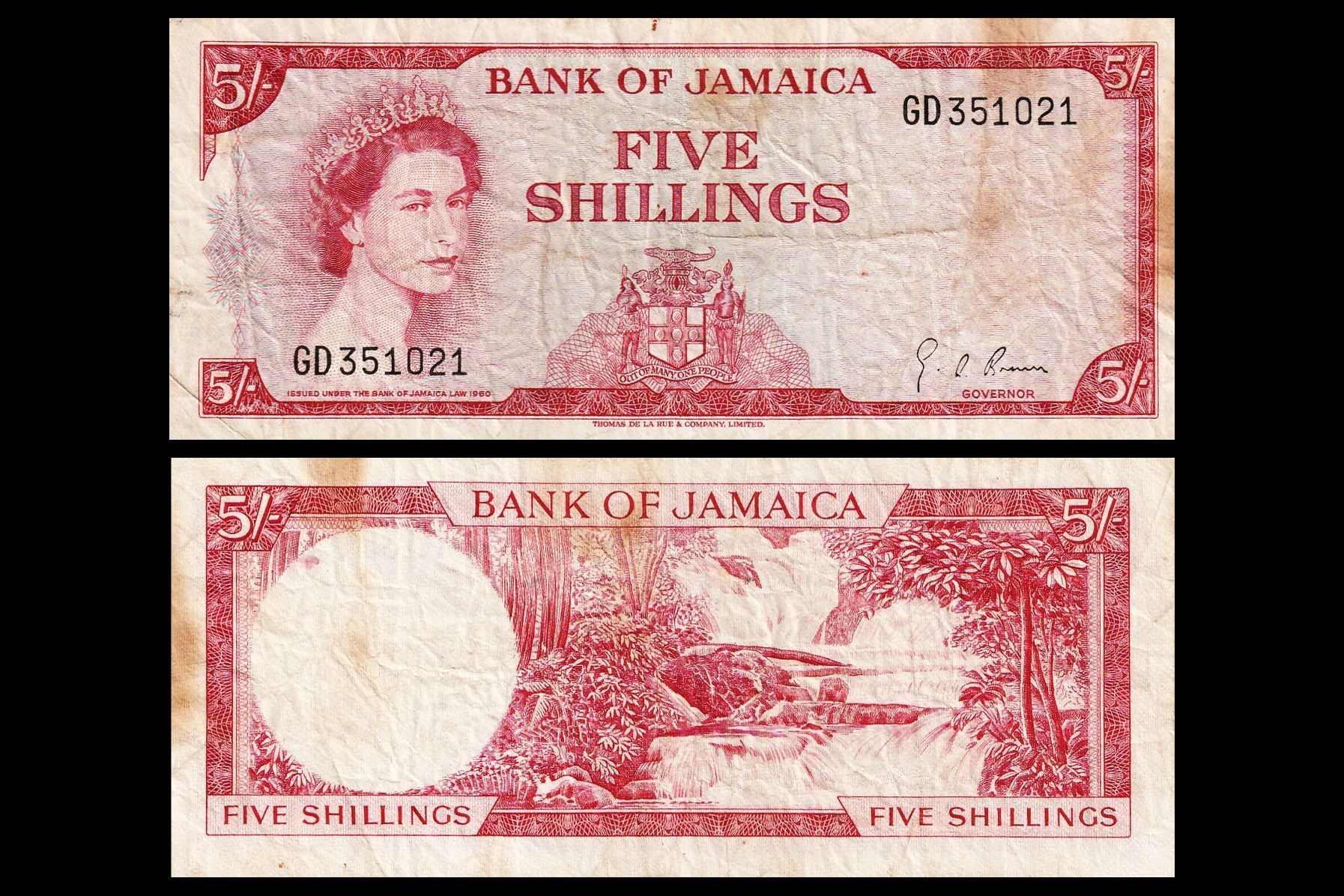 Jamaica, 5 Shillings, 1964, Obv- Elizabeth II at left, Coat of Arms at lower centre. Rev- Dunn's River falls. VF+, Scarce. NR-66.