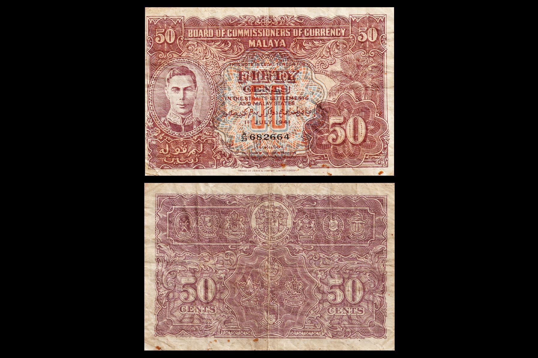 Malaya (Malaysia), 50 Cents, 1941, Obv- Portrait of King George VI at left. Rev- Shields of arms of the various Malay States with denomination below left and right. VF+, Scarce. NR-52.