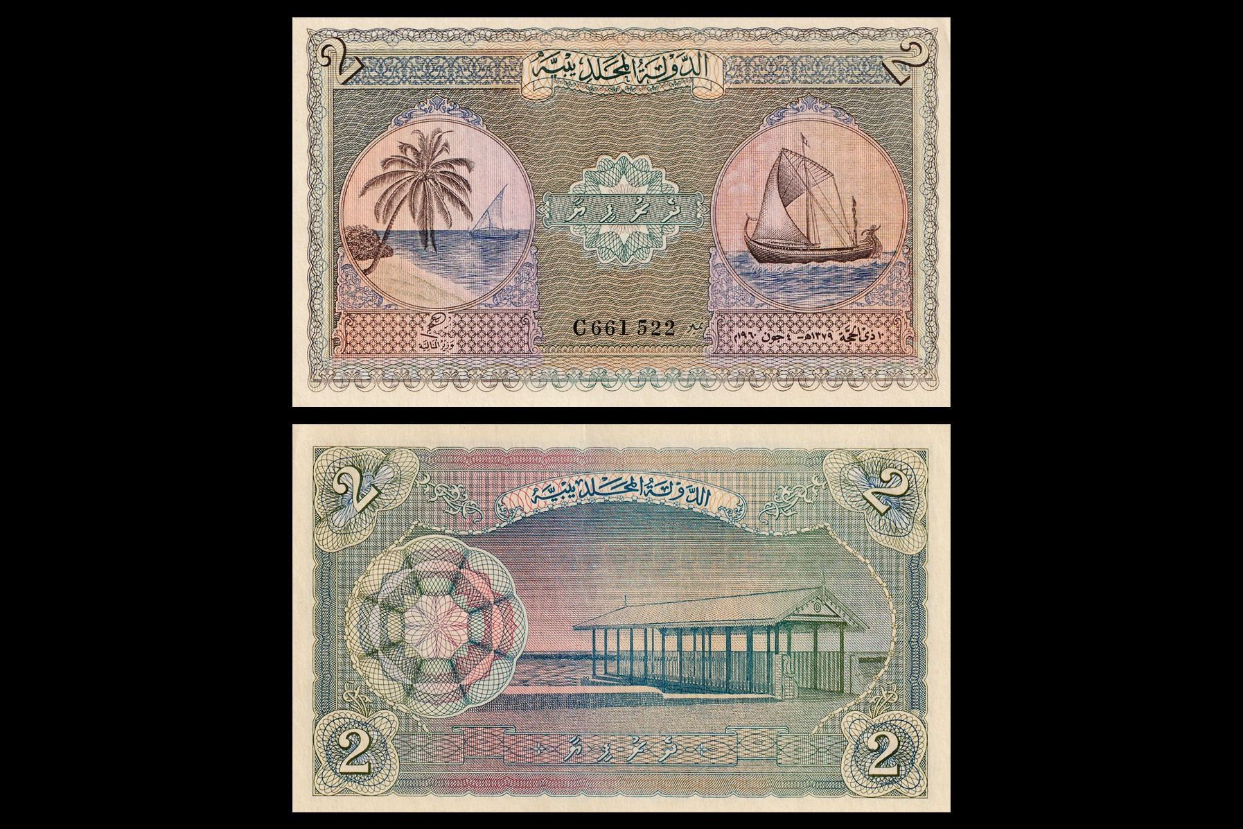 Maldives, 2 Rufiyaa, 1367-1379 (1948-1960). Obv- Palm tree and dhow at left, dhow at right. Rev- Pavilion at centre right. UNC, Scarce. NR-64.