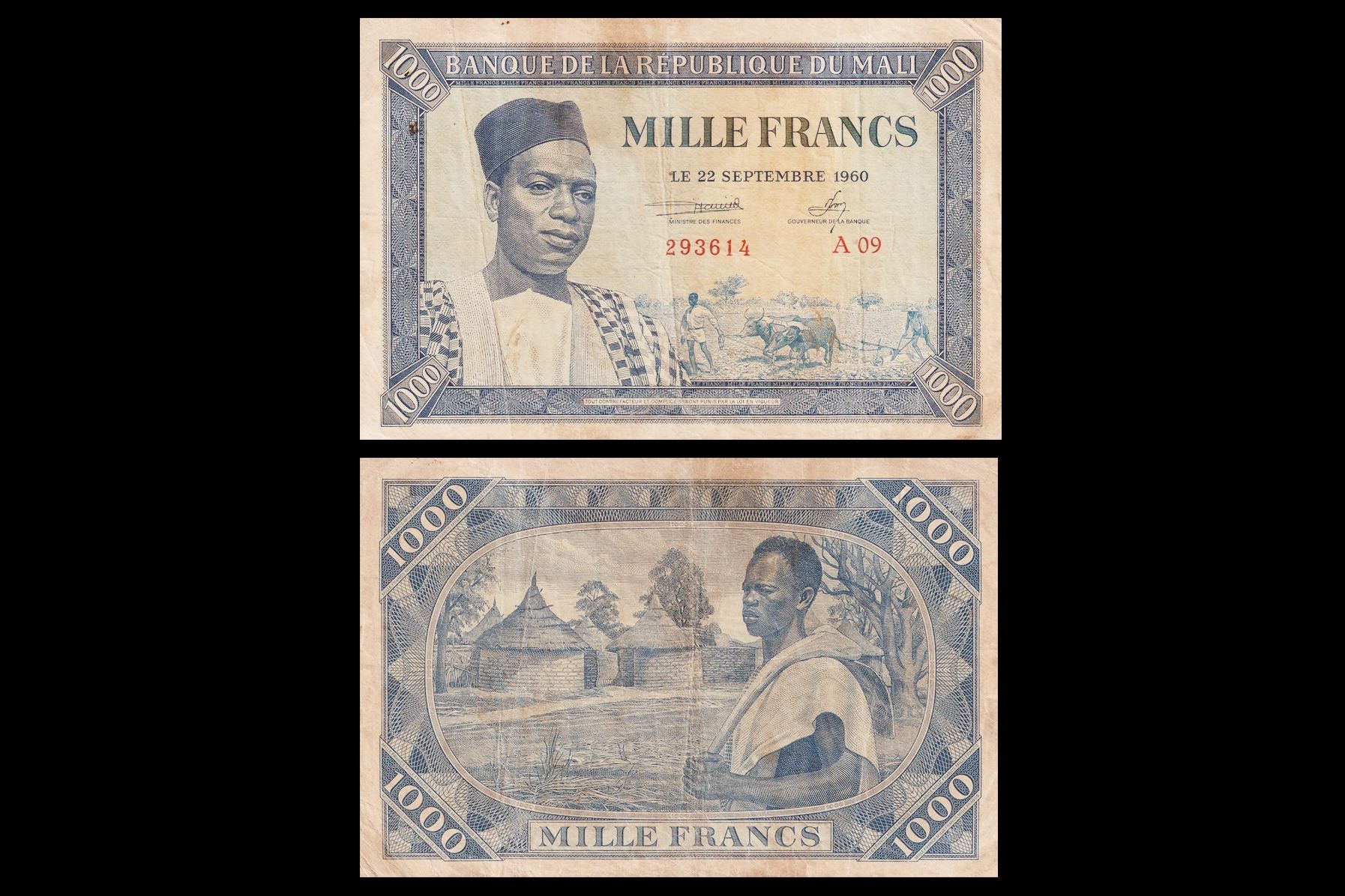 Mali, 1000 Francs, 1960. Obv- Portrait of President Modibo Keita at left; farmers plowing at lower right. Rev- Man at right, huts at left. UNC, Scarce. NR-82.