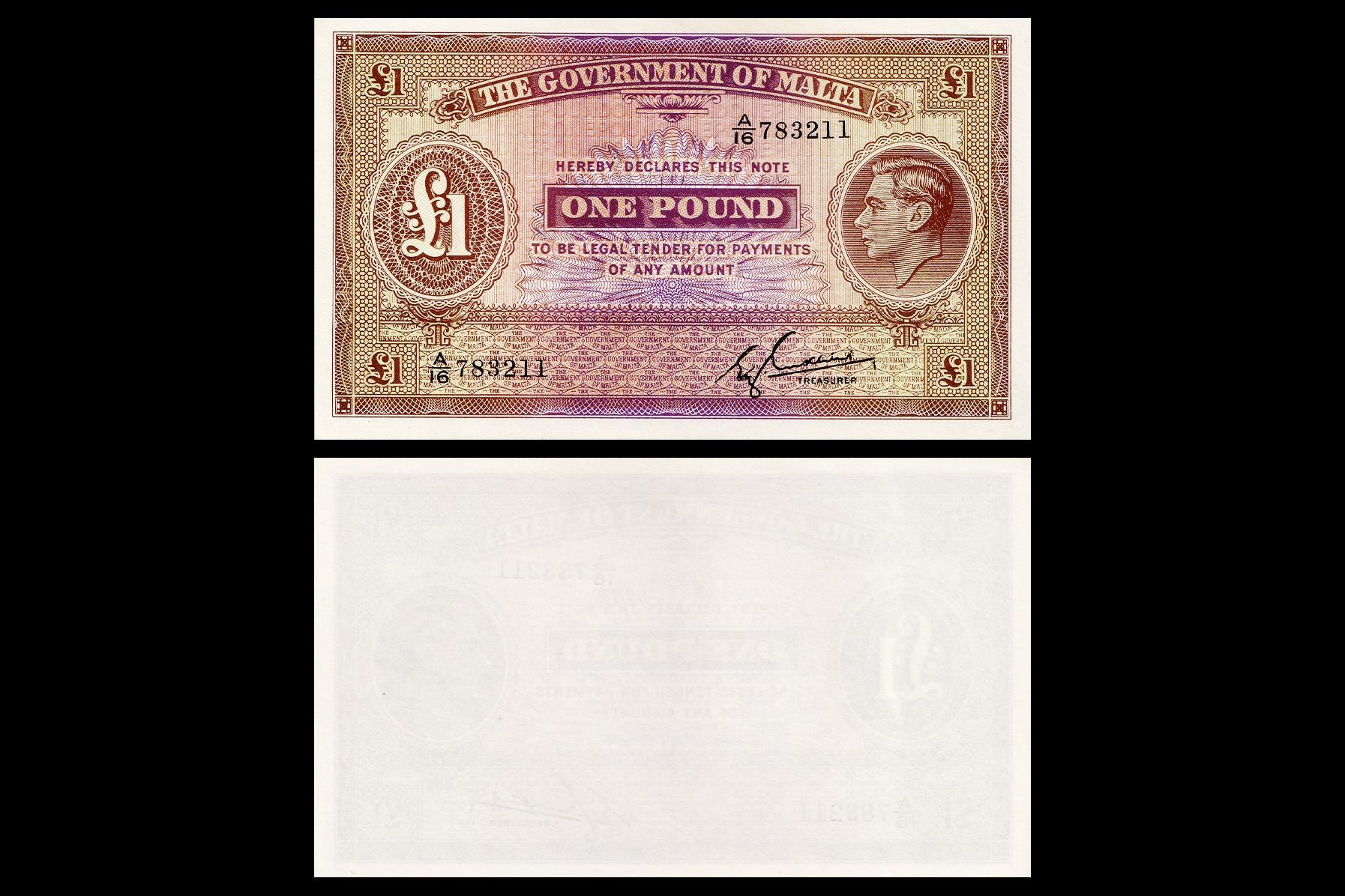 Malta, 1 Pound, 1939, Obv- Portrait of George VI at right, Denomination left. Rev- blank. UNC, Scarce. NR-84.