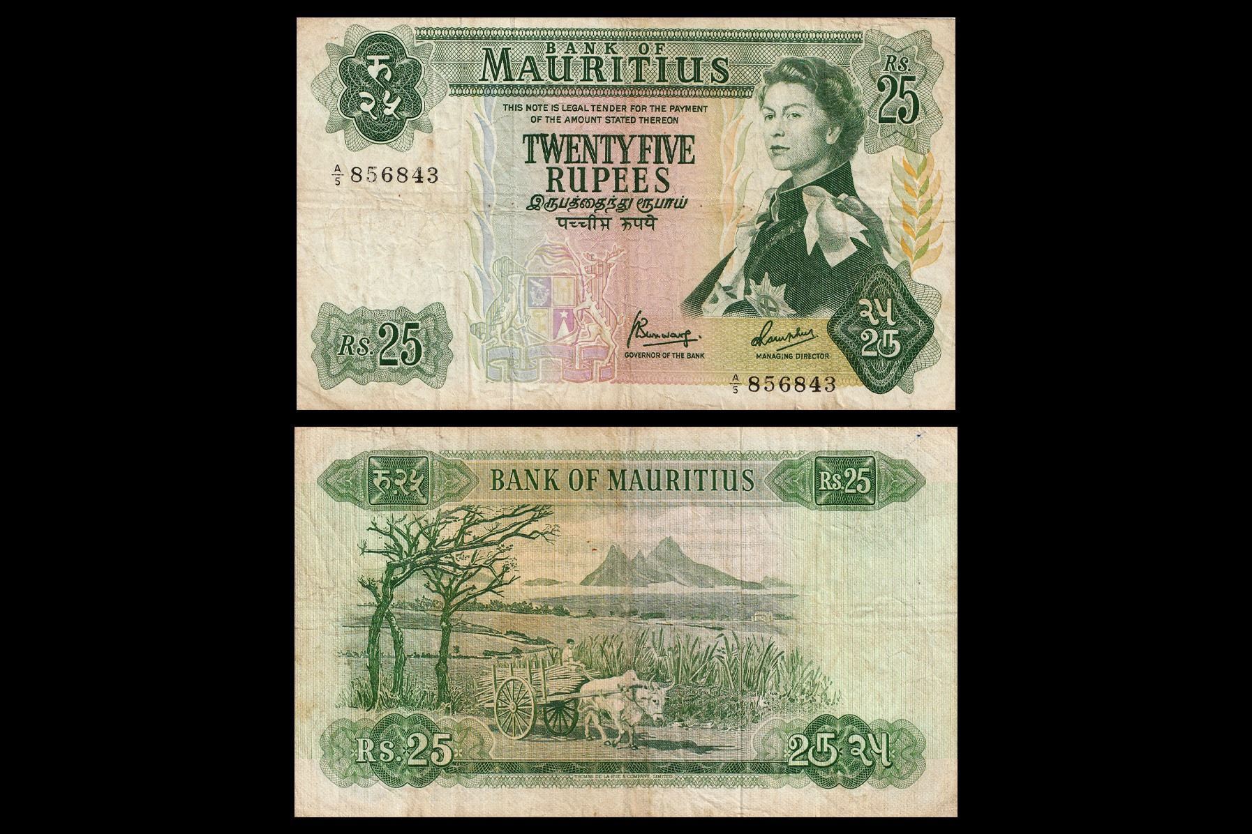 Mauritius, 25 Rupees, 1967-1978. Obv- A portrait of Queen Elizabeth II is prominently featured on the right side. Rev- A cart pulled by oxen, Sugarcane fields, Mountain range in the background (possibly Le Pouce or Pieter Both mountains). VF+, Scarce. NR-63.