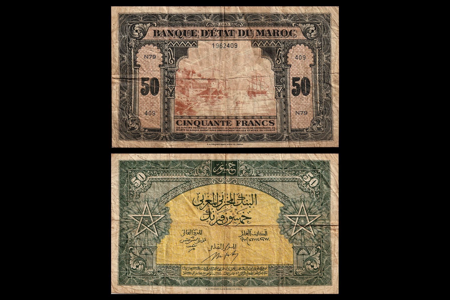 Morocco, 50 Francs, 1943-1944, Obv- A coastal scene featuring a harbor or port with traditional Moroccan architecture and sailing ships in the center. Rev- Islamic-style geometric patterns and calligraphy. VF, Scarce. NR-69.
