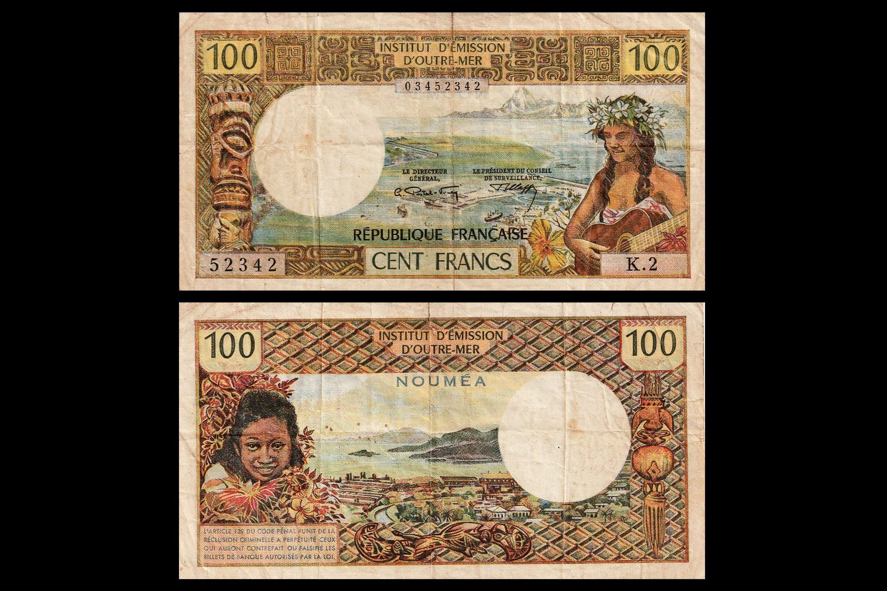 New Caledonia (Overseas France), 100 Francs, 1971-1977, Obv- Portrait of a Polynesian woman adorned with a flower crown, playing a guitar — symbolizing local island culture. Coastal scene of boats, mountains, and a tropical harbor — possibly representing Nouméa's port. Rev- A scenic panoramic view of Nouméa, the capital of New Caledonia, with hills, water, and colonial-era buildings. A Melanesian girl with a floral headdress and tribal patterns.. VF+, Scarce. NR-70.