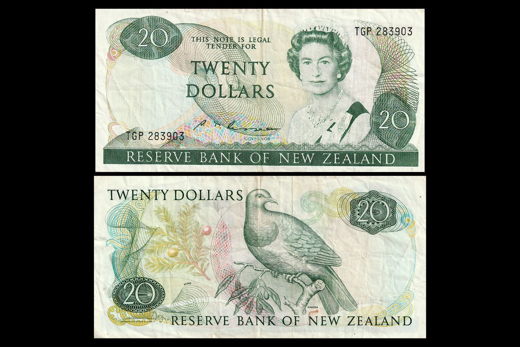 New Zealand, 20 Dollars, 1981-1992. Obv- Portrait of Young Queen Elizabeth II, wearing a tiara and pearls. Rev- A New Zealand pigeon (Kereru or Hemiphaga novaeseelandiae) perched on a native branch, Miro tree leaves and berries. XF, Scarce. NR-61.