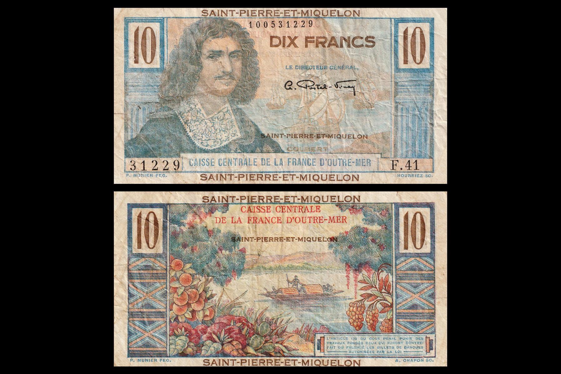 Saint-Pierre and Miquelon (Overseas France), 10 Francs, 1950-1960. Obv- Portrait of Jean-Baptiste Colbert at left; fleet of commercial boats at right. Rev- Lush floral landscape with view of river and dugout canoe. NR-57, VF+, Rare