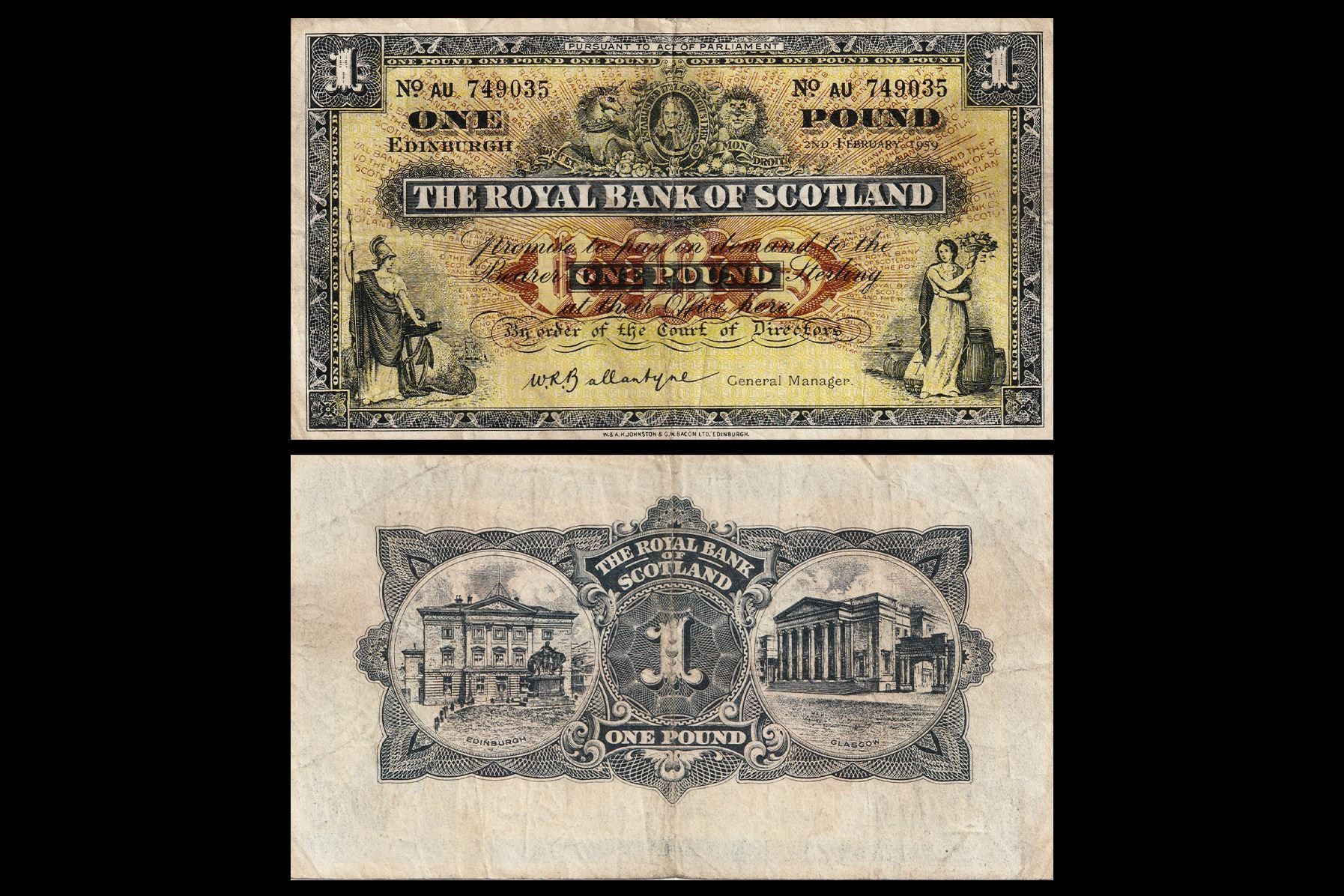 Scotland (United Kingdom), 1 Pound, 1937-1964. Obv- Crest featuring George I at top, Britannia at bottom left. Rev- Royal Bank of Scotland buldings in Edinburgh (left) and Glasgow (right). NR-63, VF+, Rare