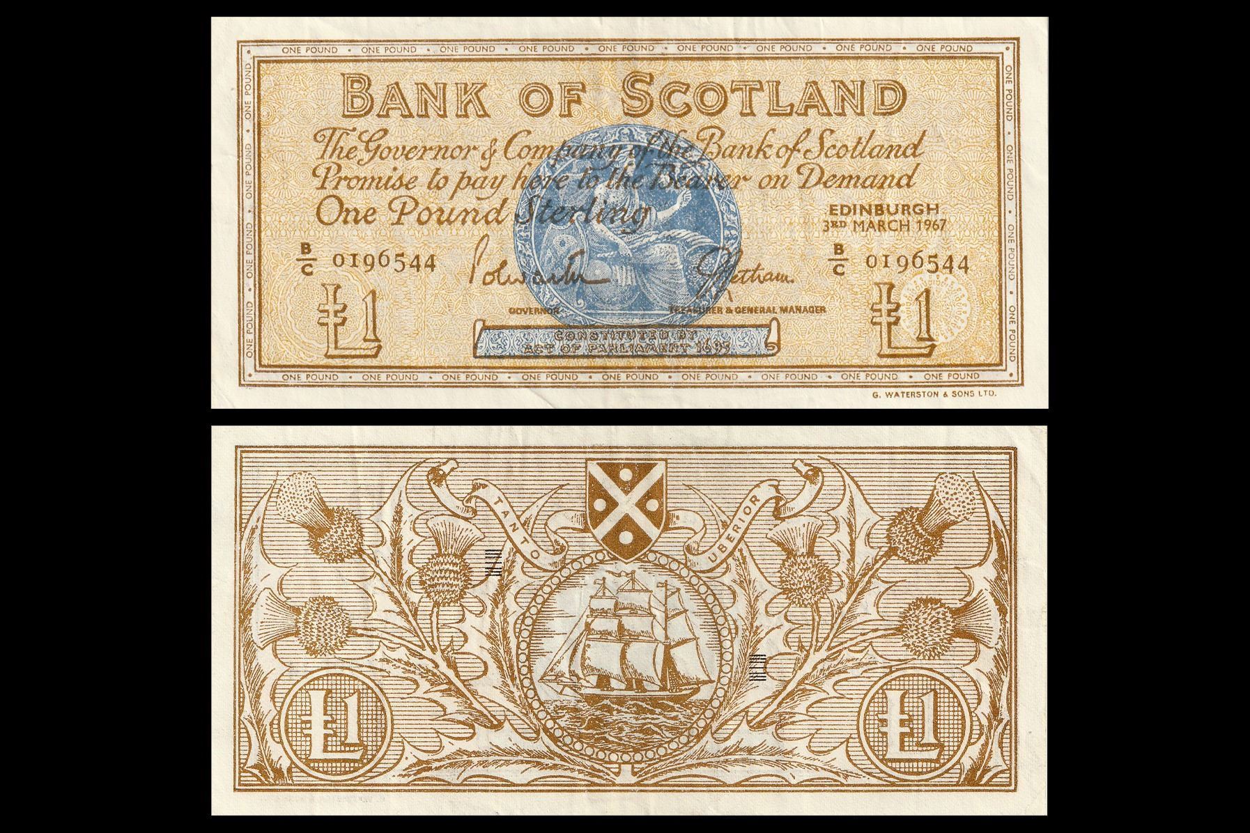 Scotland (United Kingdom), 1 Pound, 1937-1964. Obv- Light brown with a light blue medallion featuring woman in centre. Denominations both sides. Rev- Sailing ship in the centre surrounded by thistles. Bank arms at top. NR-62, XF+, Rare.