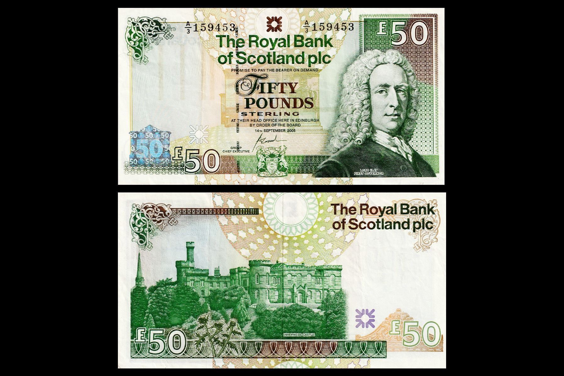 Scotland (United Kingdom), 50 Pounds, 2005. Obv- Lord Ilay 1st Governor at right, Hologram at left bottom. Rev- Inverness Castle. NR-79, UNC, Rare.
