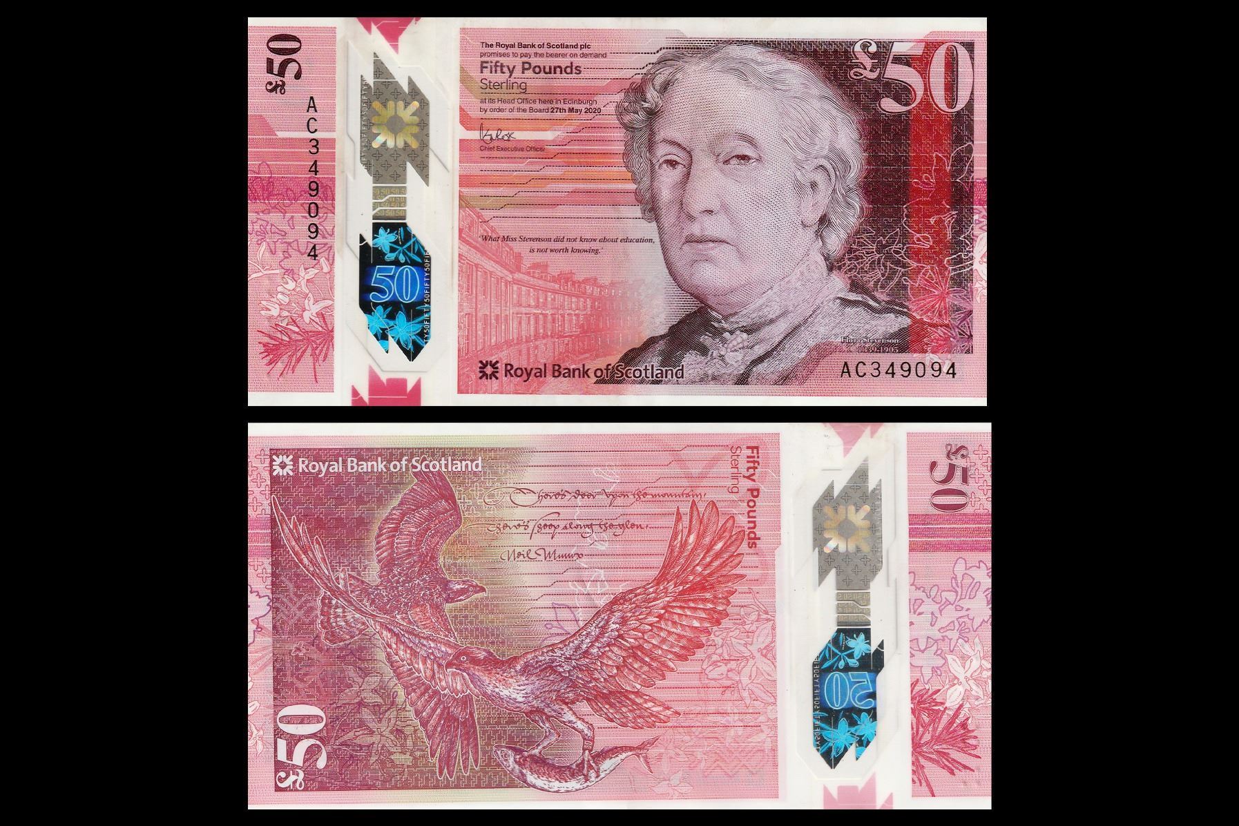 Scotland (United Kingdom), 50 Pounds, 2020. Obv- Flora Stevenson at right. Rev- Two ospreys. NR-68, UNC, Rare.