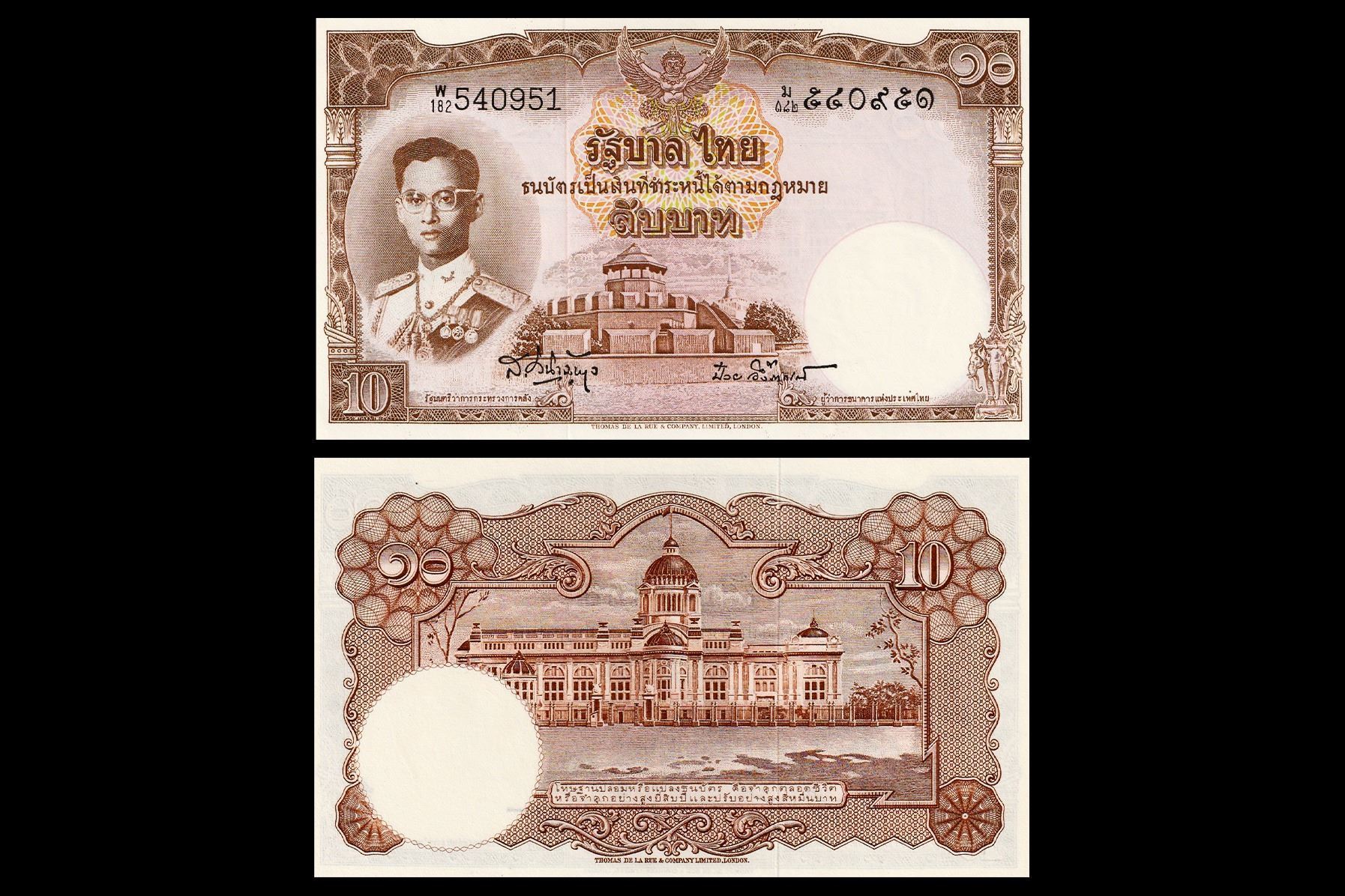 Thailand, 10 Bahts, 1953-1974. Obv- King Bhumibol Adulyadej in the Uniform of the Supreme Commander in window on left, Pharakarn Fortress (City wall fortification). Rev- Anandasamakom Throne Hall. NR-33, UNC, Rare.