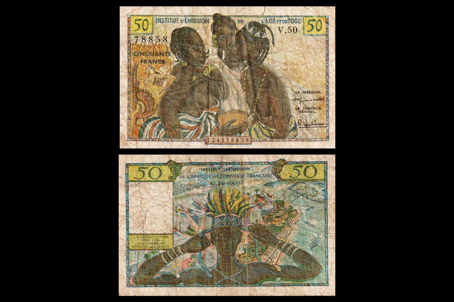 French West Africa, 50 Francs, 1956, Obv- Three women at centre. Rev- Woman at centre, city view in background. NR-58, VF+, Rare.