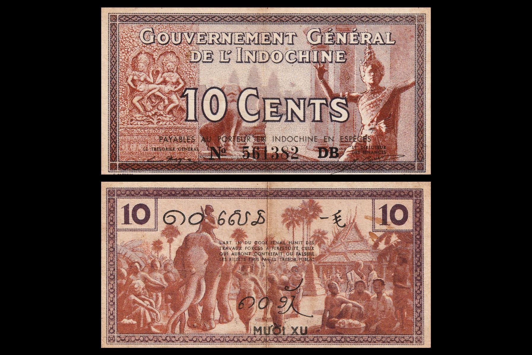 French Indochina, 10 Cents, 1939. Obv- Apsara, celestial dancers stone carving to the left, Angkor Wat in the background. Dancer in foreground. Rev- Village Scene, Asian Elephants, denomination in Lao, Khmer, Vietnamese, and Chinese. NR-33, UNC, Rare.