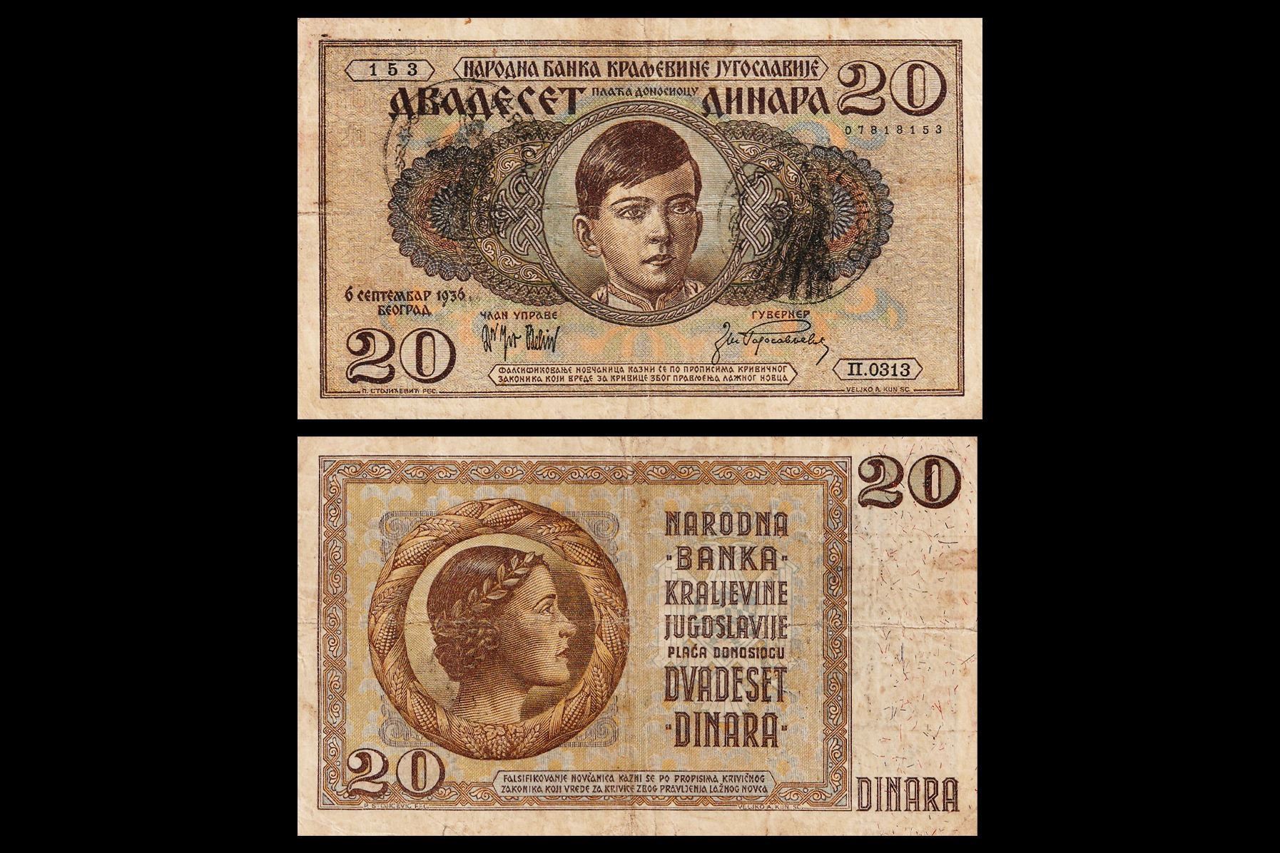 Montenegro, 20 Dinars, 1941, Obv- Portrait of King Peter II of Yugoslavia in the middle. Rev- Queen Maria of Yugoslavia in the middle (Marija Karadordevic). NR-92, VF+, Rare.