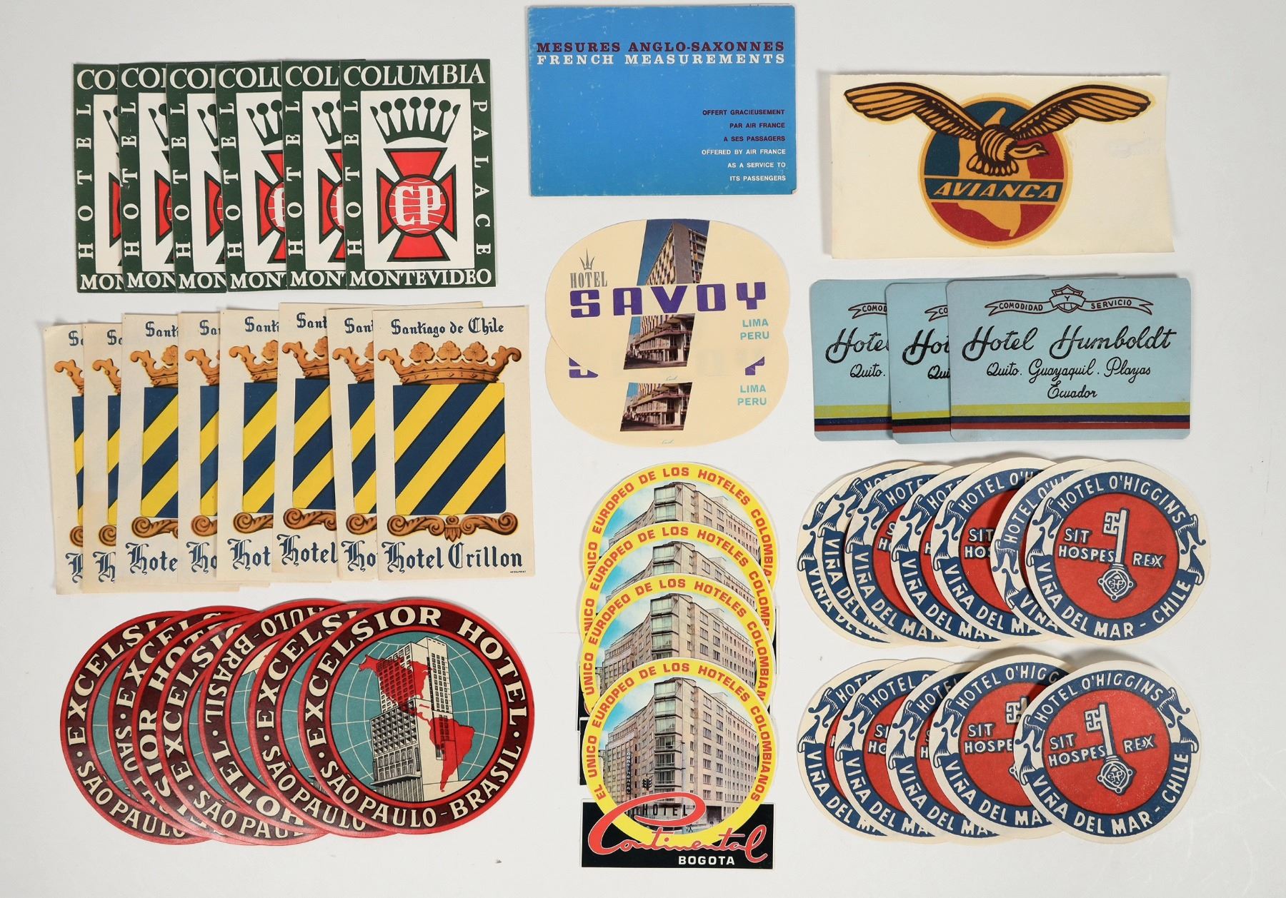 Foreign trunk labels, predominantly from South America c1900-1920. Good condition, some labels with toning. Generally vibrant colors with few to no creases. Several duplicates. About 3x5".