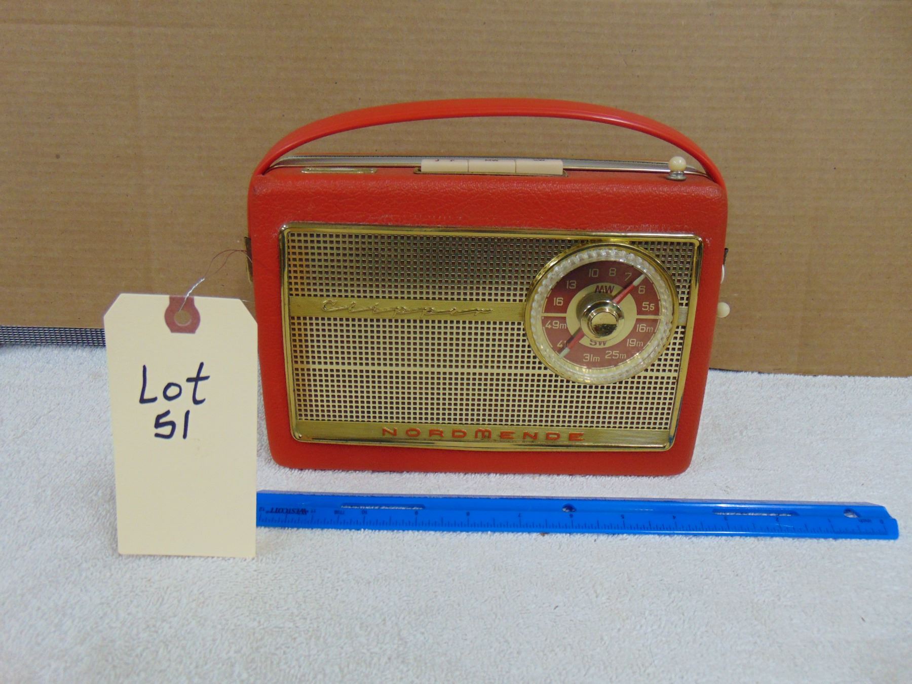 Normende Clipper two band portable; nice red case; has small repairable tear on top left cabinet