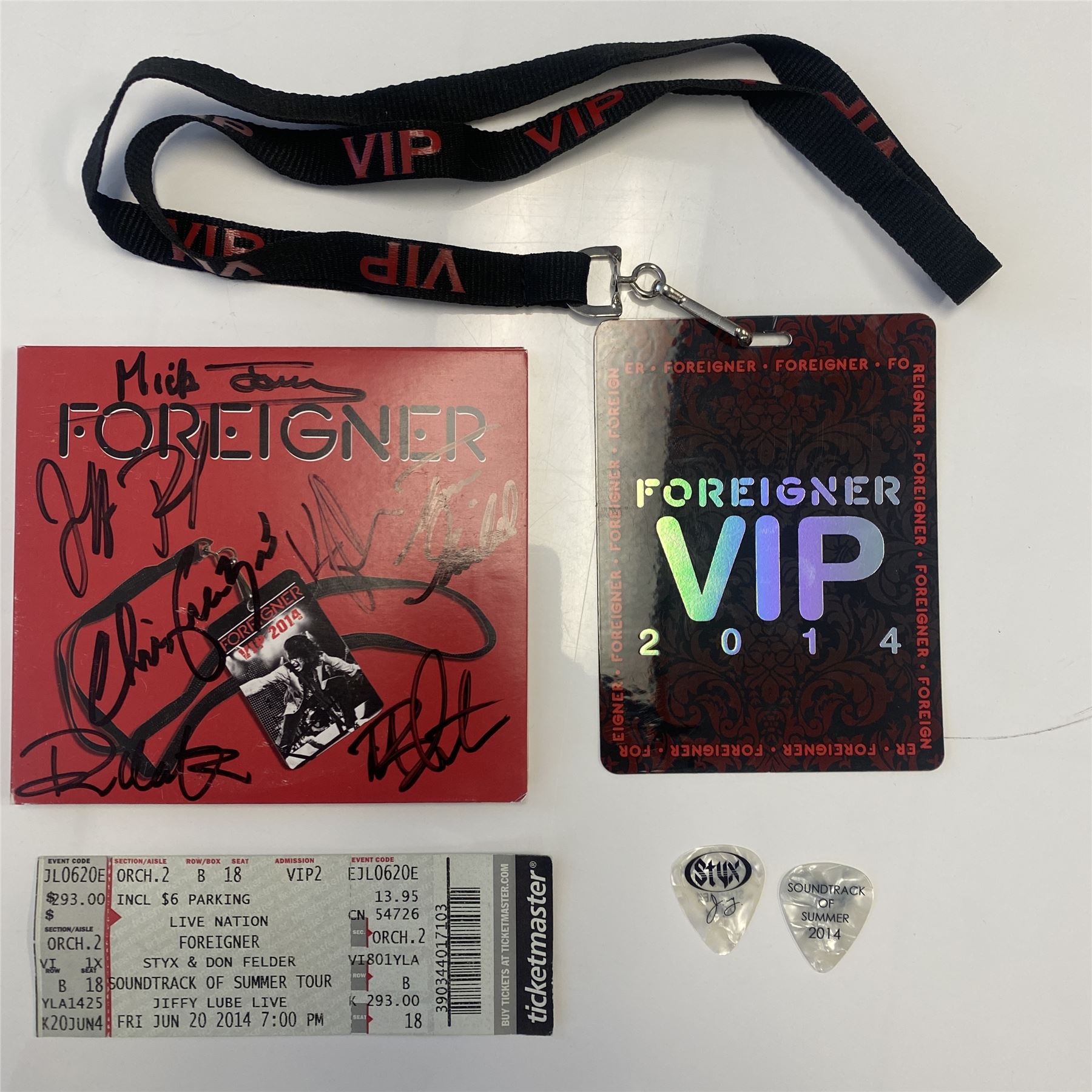 Foreigner 2014 Limited Edition VIP Collection. CD cover autographed by Mick Jones, Kelly Hansen, Chris Frazier, Deen Castronovo, Jeff Pilson, Bruce Watson, Joel Hoekstra. CD 5 x 5 inches.