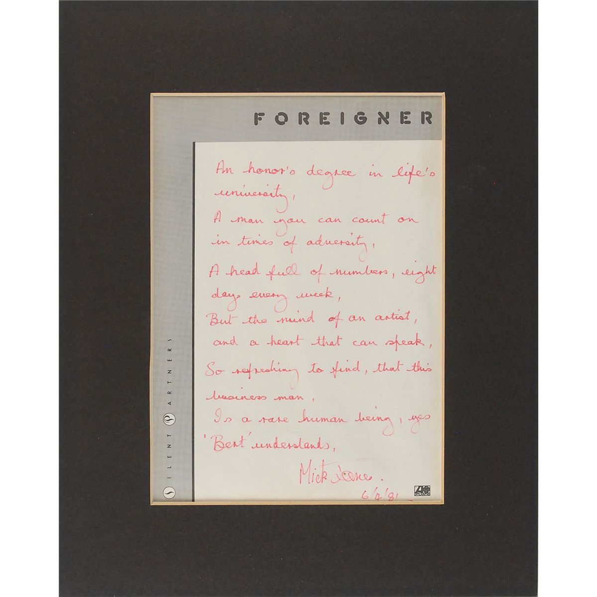 Handwritten poem, signed “Mick Jones,” one page, 4.75 x 6.75, Foreigner letterhead, June 4, 1981. A thoughtful poem written for entertainment manager Bert Padell. In full: “An honor’s degree in life’s / university, / A man you can count on / in times of adversity, / A head full of numbers, eight / days every week, / But the mind of an artist, / and a heart that can speak, / So refreshing to find, that this / business man, / Is a rare human being, yes ‘Bert’ understands.” Matted to an overall size of 8 x 10. In fine condition, with light creases and edge toning.