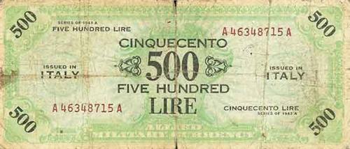 Foreigner Occupation in Italy - - - II Guerra Mondiale - Occupazione militare alleata - Banconota da 500 Lire 1943 - Emissione bilingue Zecca: - Diritto: - Rovescio: - Marcati difetti di circolazione - Da esaminare