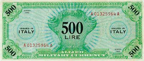 Cartamoneta - Occupazioni straniere in Italia - Seconda Guerra Mondiale - Occupazione Militare Alleata - Banconota da 500 Lire emissione monoligue - Zecca: - Diritto: - Rovescio: - Pieghe verticali restaurate e forellino centrale - Di buona qualità - Da esaminare - Pieghe verticali restaurate e forellino centrale - Di buona qualità - Da esaminare