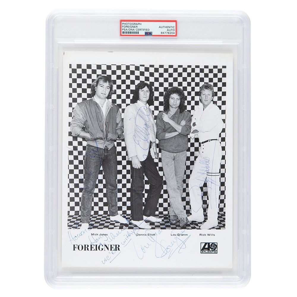 Glossy 8 x 10 Atlantic Records publicity photo of Foreigner against a checkered backdrop, signed and inscribed in blue ballpoint, & ldquo;Howard, Hang in there! We& rsquo;re with you& mdash;Lou Gramm, Foreigner.& rdquo; Also signed vertically in blue ballpoint by Mick Jones, Dennis Elliott, and Rick Wills. In very good to fine condition, with a crease passing across Jones& #39; chest. Encapsulated in a PSA/DNA authentication holder.