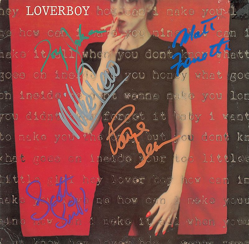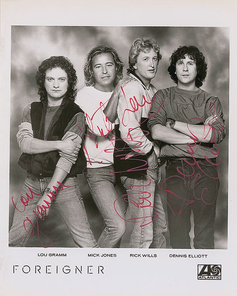 Glossy 8 x 10 Atlantic Records publicity photo of Foreigner, signed in red paint pen by Lou Gramm, Mick Jones, Rick Wills, and Dennis Elliott; and Loverboy’s self-titled debut album, signed on the front cover in colorful paint pen by Mike Reno, Paul Dean, Doug Johnson, Scott Smith, and Matt Frenette. The record is included. In overall fine condition, with scattered creases and price tag adhesive remnants to the Loverboy album.