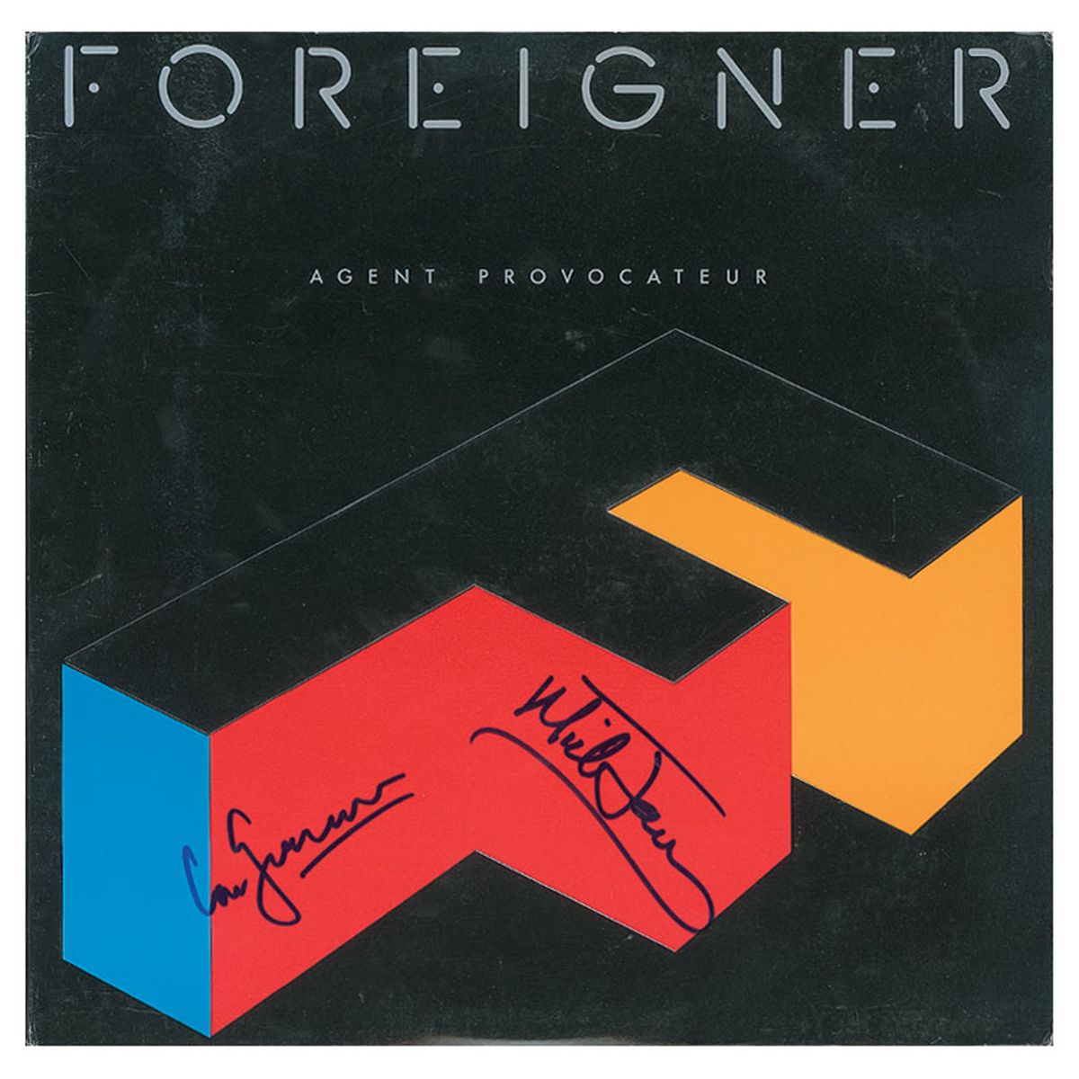 Agent Provocateur album signed on the front cover in blue felt tip by Lou Gramm and Mick Jones. In fine condition, with mild ‘ring of wear’ to cover. The record is included.