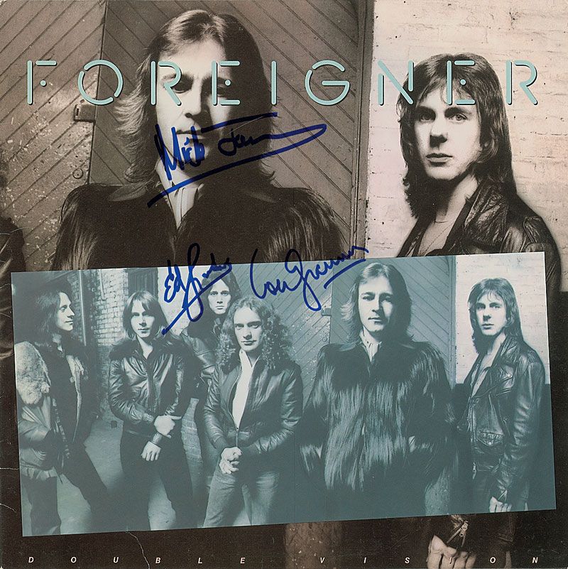Double Vision album signed on the front cover in blue felt tip by Mick Jones, Lou Gramm, and Ed Gagliardi. In fine condition. The record is not included.