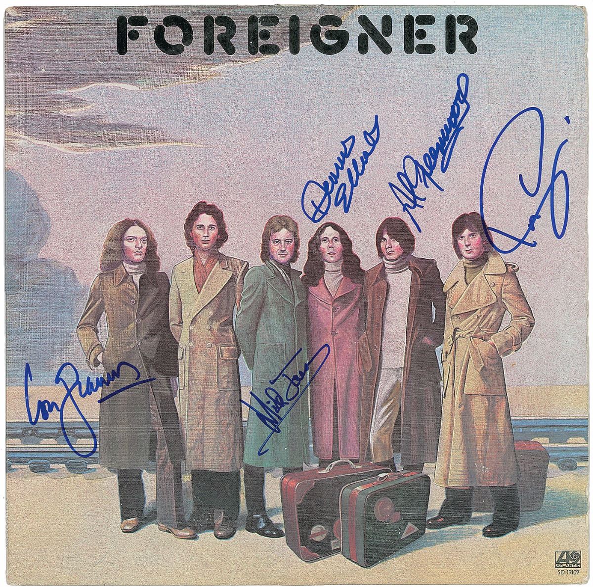 Self-titled debut album signed on the front cover in blue felt tip by Mick Jones, Lou Gramm, Dennis Elliot, Al Greenwood, and Ian McDonald. In fine condition. The record is not included.