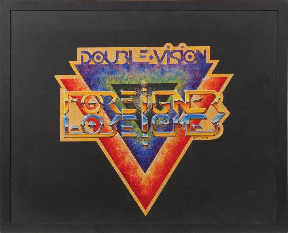 Vibrantly colored original hand-painted concept artwork by Alton Kelley for Double Vision, the second full-length album from Foreigner. The vivid logo design has been accomplished in ink and gouache on black 19.25 x 15.25 artist’s board, showing a pair of metallic band names over three triangles, and the album name along the top. Signed in the right side of the logo in black ink by the artist, “Kelley,’78.” Matted and in fine condition. Although photographic images were ultimately settled on for use on the Double Vision album cover, this artwork is even more vibrant and was painted by one of the most important gig poster artists of the 1960s and 1970s. Kelley was a frequent collaborator with fellow noted poster artists Stanley Mouse, Rick Griffin, Victor Moscoso, and Wes Wilson. Intended for Foreigner’s very successful Double Vision album, this is an exceedingly desirable piece of original artwork.