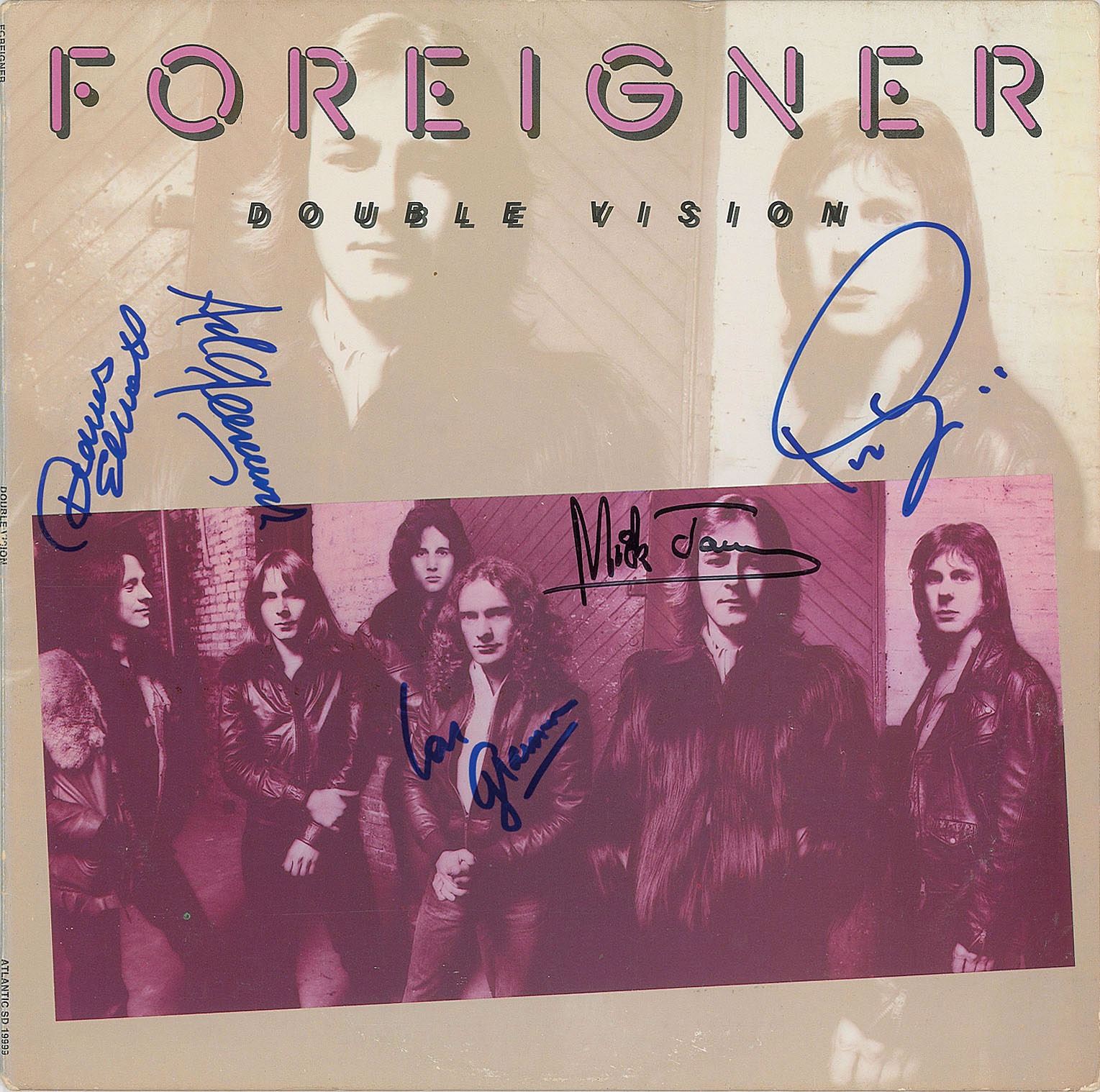 Double Vision album signed on the front cover in black felt tip by Mick Jones, and in blue felt tip by Lou Gramm, Ian McDonald, Al Greenwood, and Dennis Elliott. In fine condition. The record is not included.