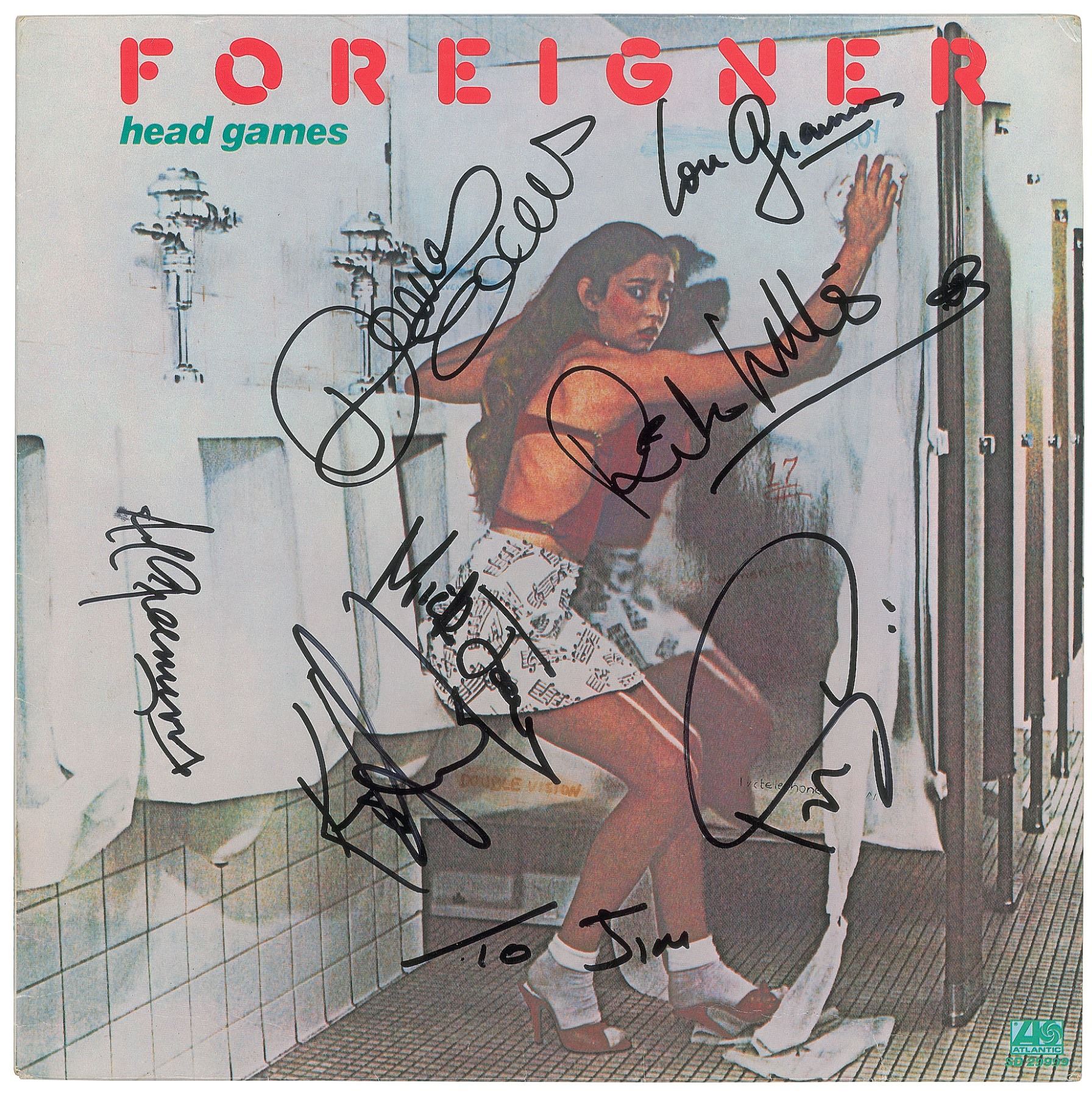 Head Games album by Foreigner, signed on the front cover in black felt tip by Lou Gramm, Dennis Elliott, Al Greenwood, Ian McDonald, Mick Jones, Rick Wills, and Kelly Hansen, with one adding an inscription "To Jim." In fine condition. The record is not included.
