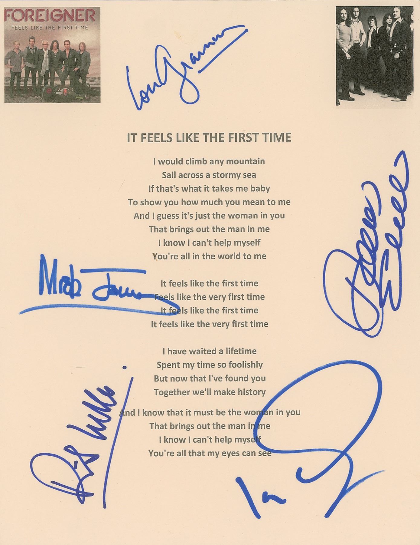 Souvenir printed lyrics for the song 'It Feels Like the First Time' on an off-white 8.5 x 11 sheet with images of Foreigner and the single album cover to upper corners, signed in blue and purple felt tip by Lou Gramm, Dennis Elliott, Ian McDonald, Mick Jones, and Rick Wills. In very fine condition.